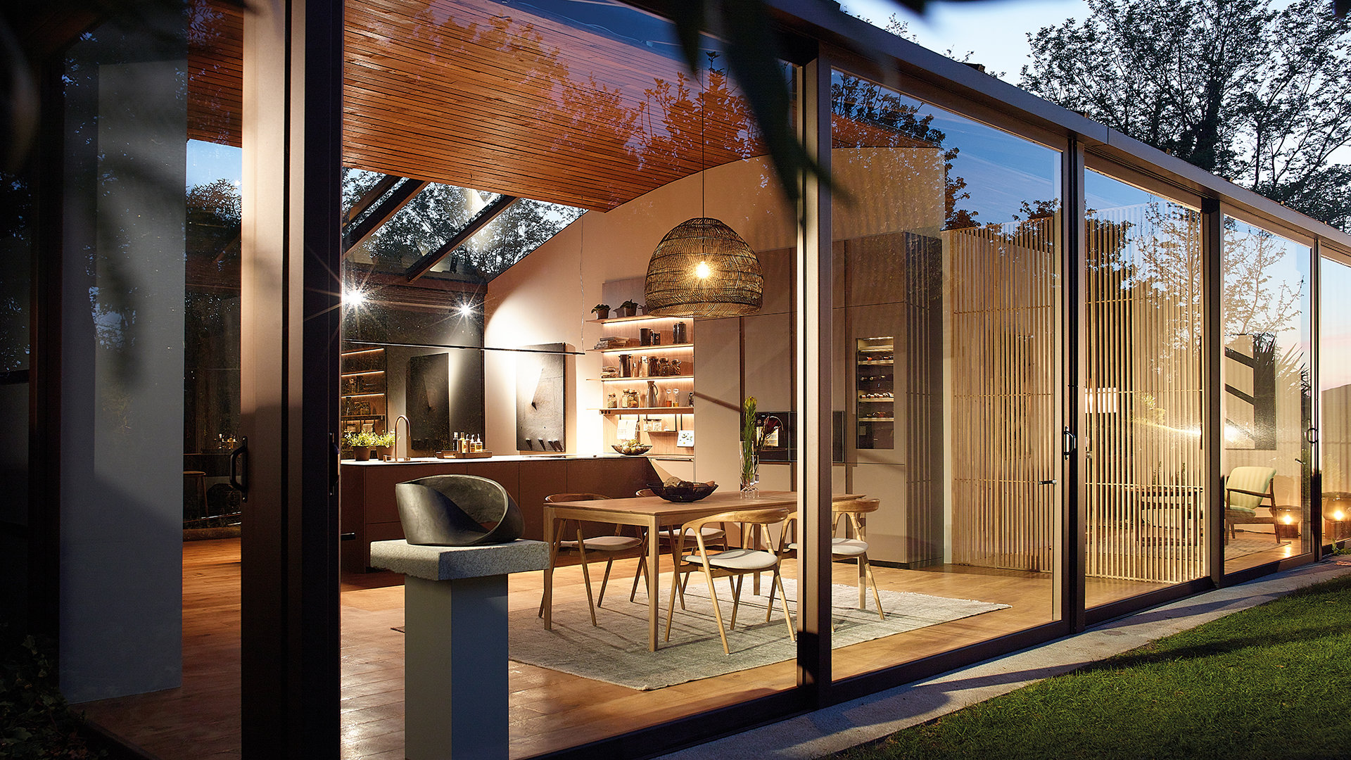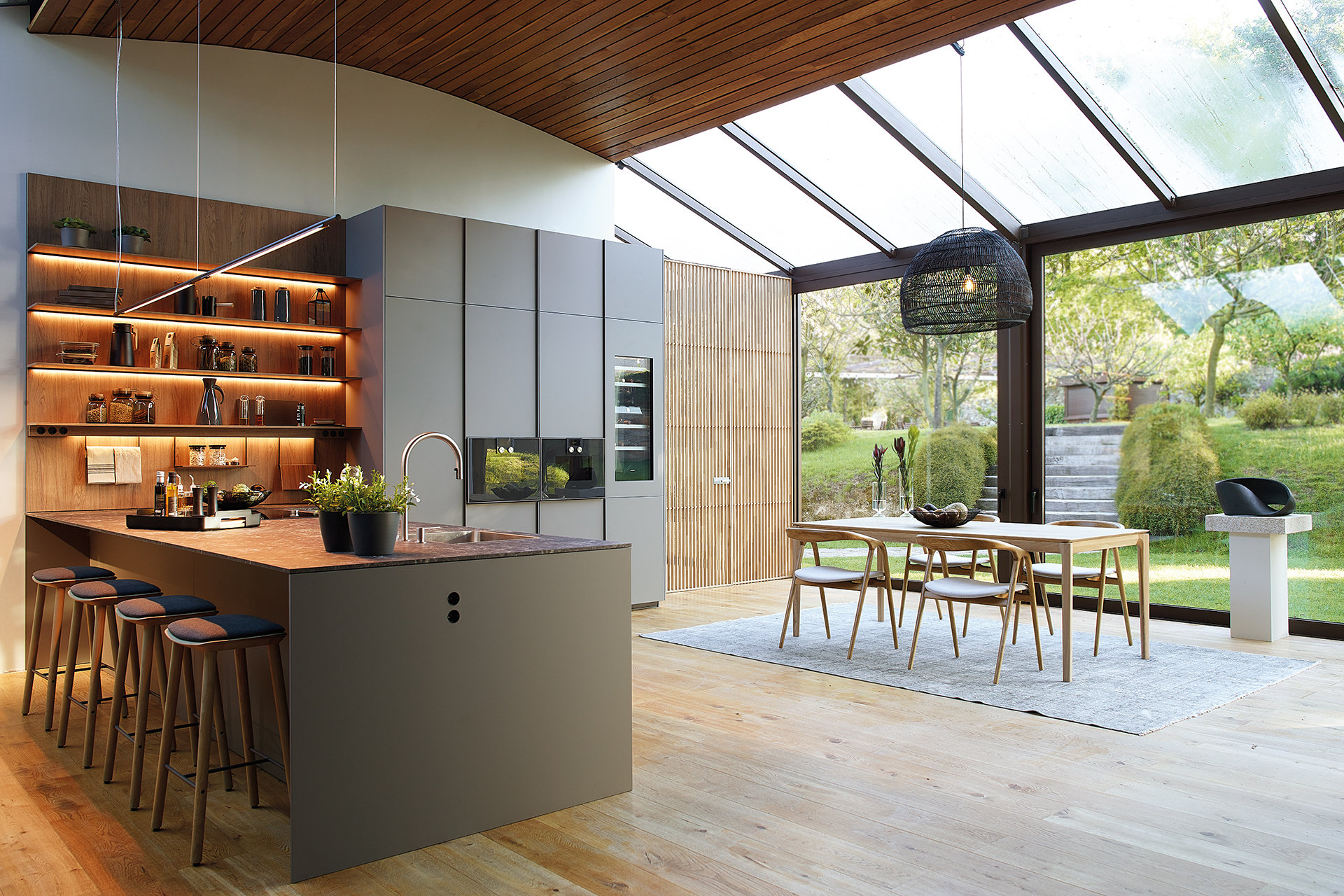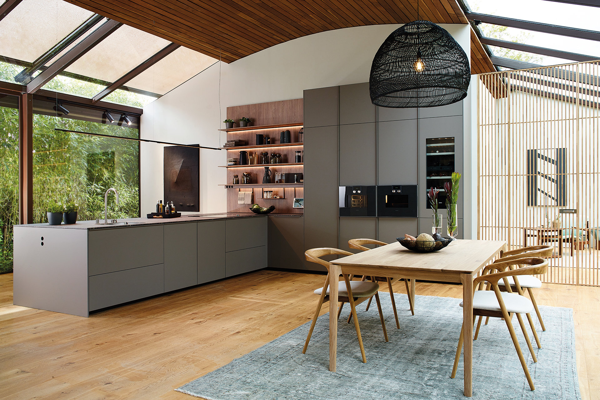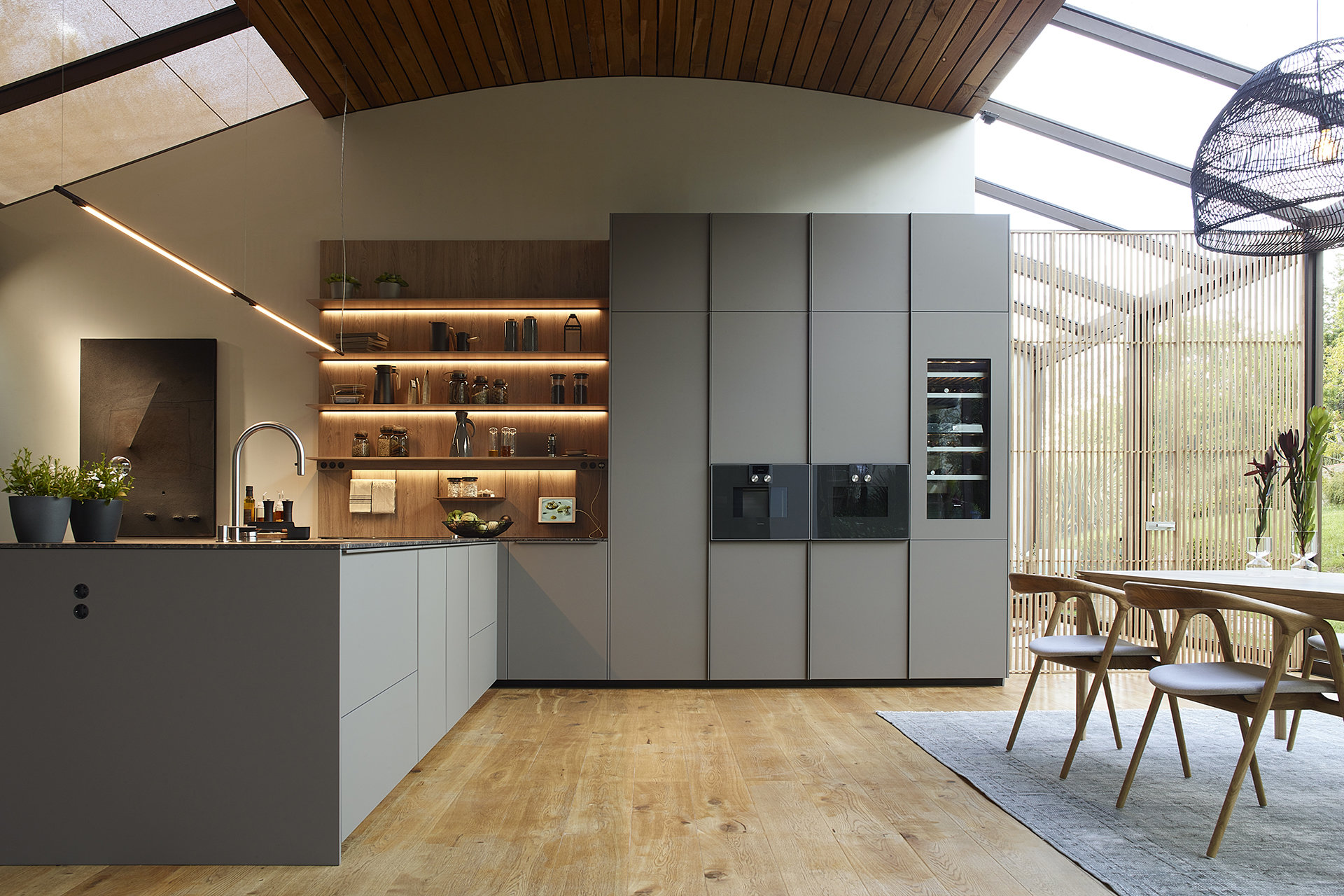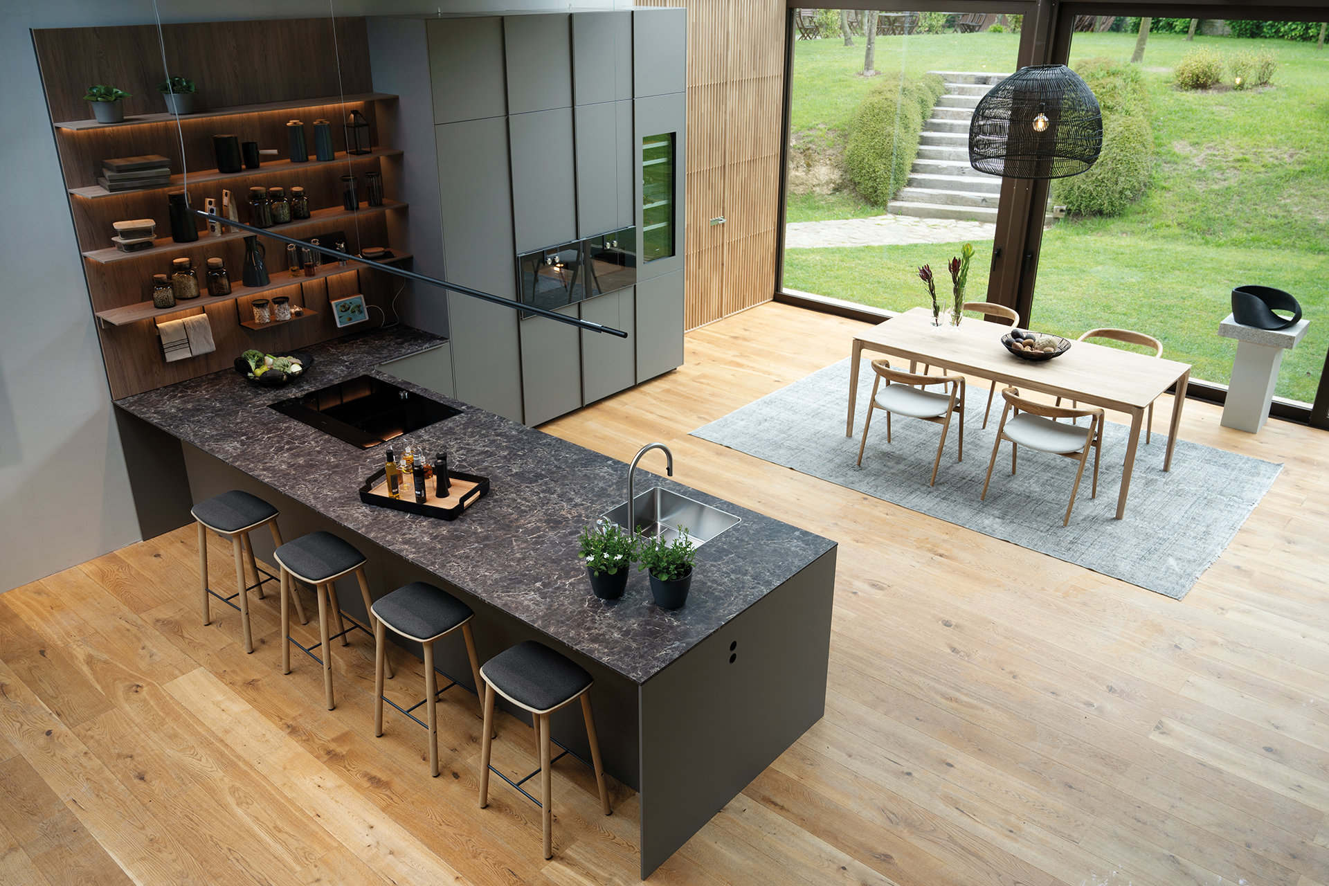 The open-plan grey kitchen shares a large, free-flowing space with the dining room and the reading area, constituting the hub of family life during the day. The pure lines of the furniture contribute to its seamless integration into an open and multipurpose space. Food preparation, washing-up and cooking tasks are done in a large peninsula, which – running parallel to the dining room – serves as a transition between the areas for work and leisure.