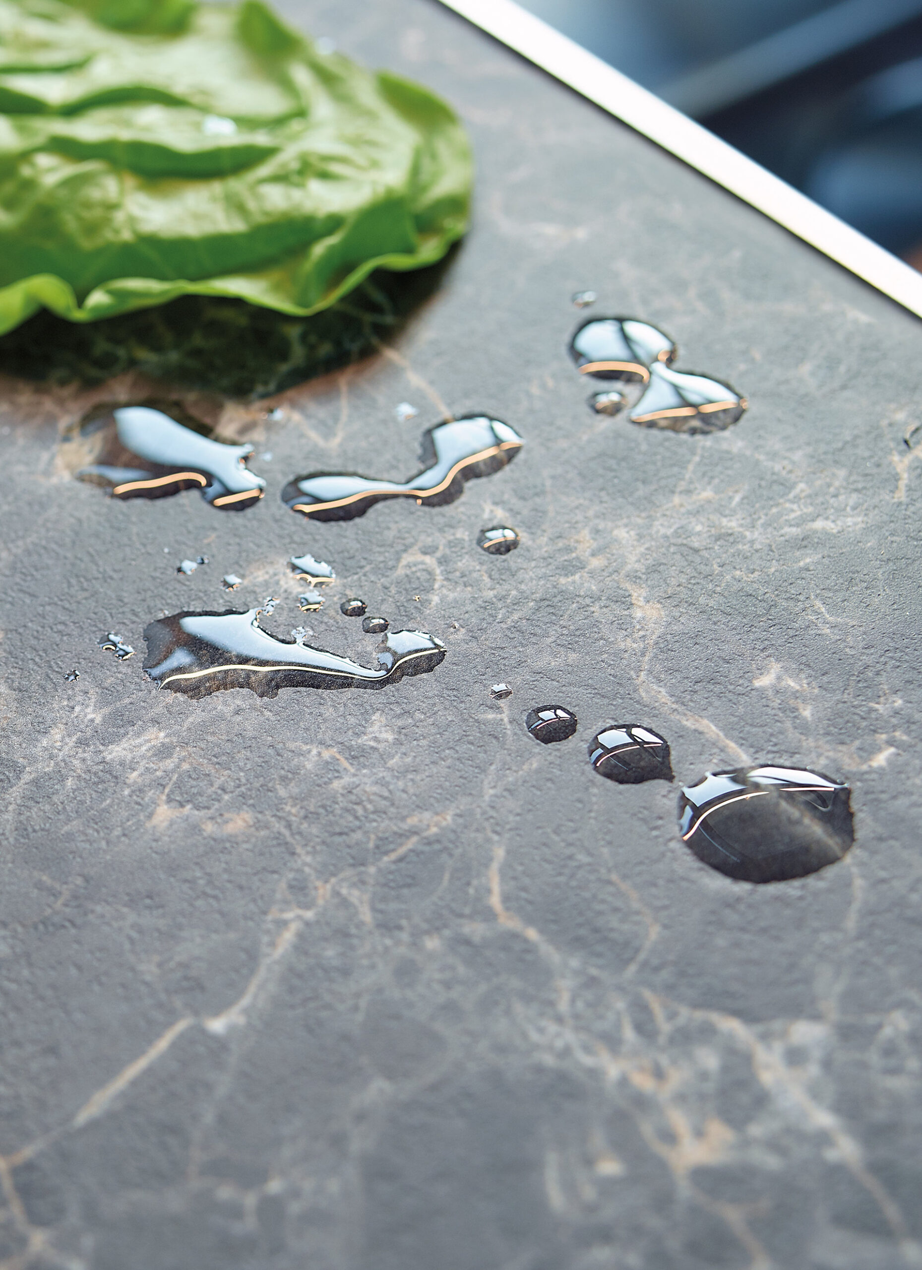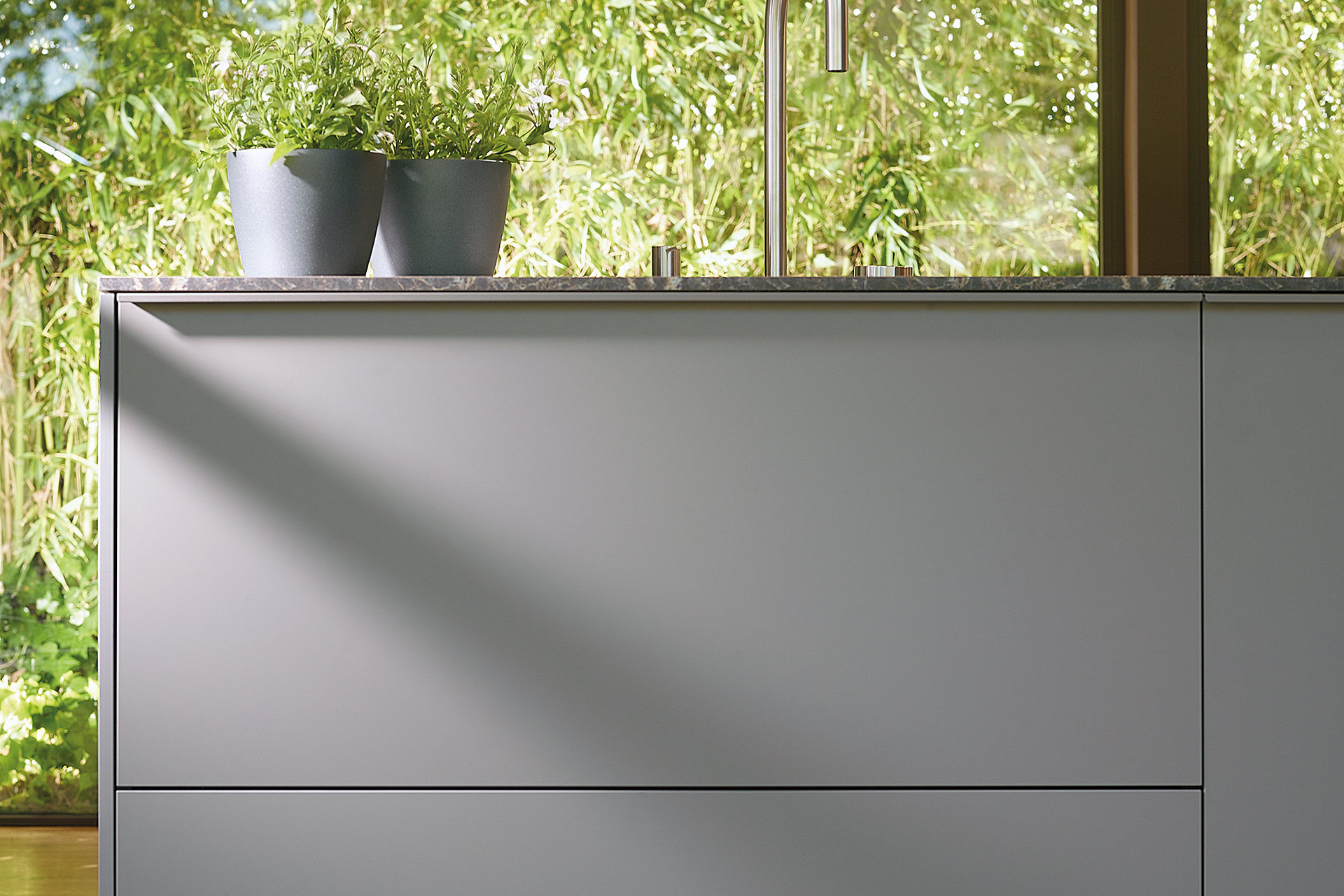 With its whimsical elegance, the Emperor Marble laminate worktop adds a special touch to the whole. The profile handle, with its sleek and practical design, makes it easy to open and access the contents of both base units and tall units.