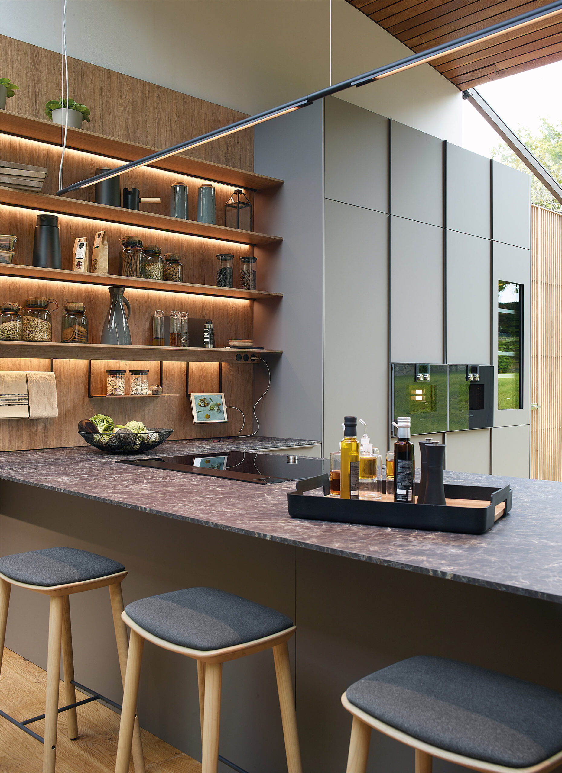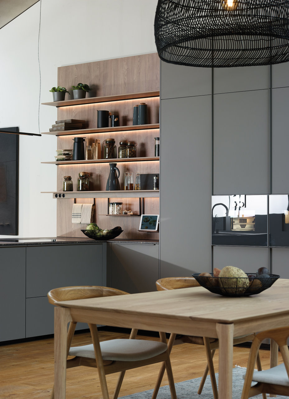 A shelving unit with wall panel and shelves optimises and stratifies the available space above the worktop, making it possible to always have containers, cookbooks or cooking utensils to hand. The shelving unit comes with two exclusive lighting systems. One of them, integrated into the rear edging of the shelves, projects indirect decorative lighting onto the panel. The other, installed beneath the lower shelf, provides extra lighting on the work surface. The latter comes with power sockets and a slit for kitchen accessories.
