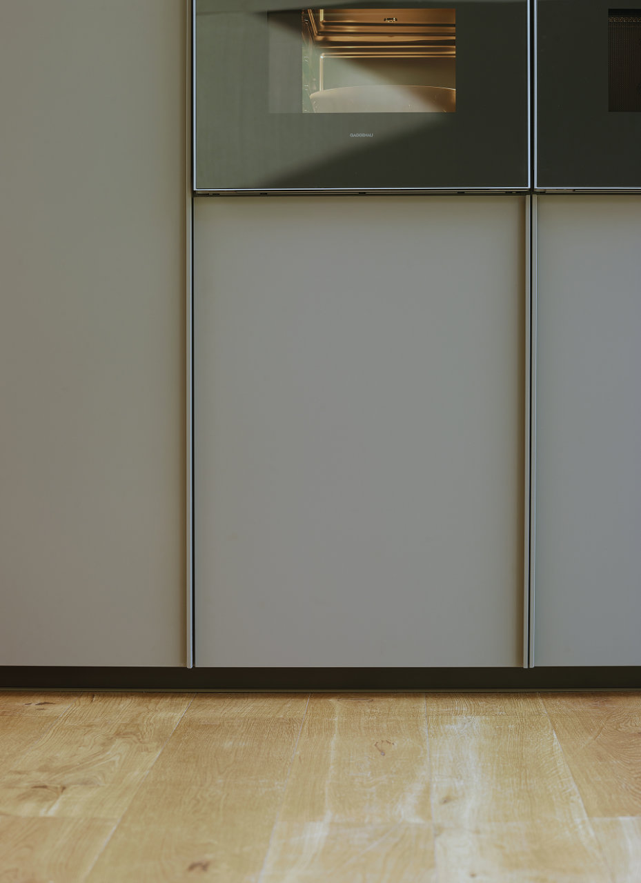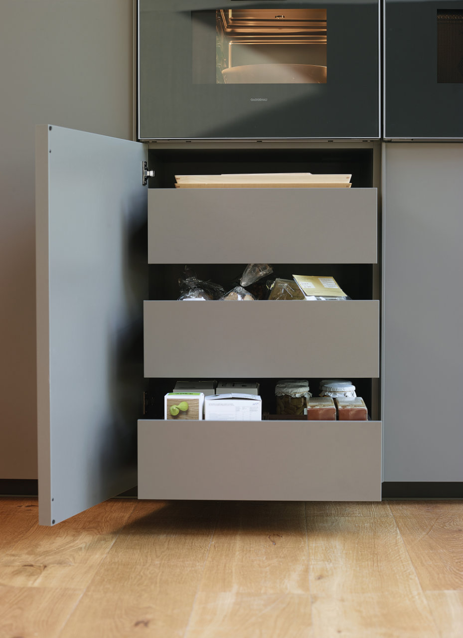 The tall units house a fridge, ovens and a wine cooler. The top box units expand their capacity up to the ceiling, providing storage for rarely used items that would otherwise take up valuable space in the kitchen. The bottom section of these units features three tiers of full-extension interior double drawers, designed to make it easier to access these hard-to-reach areas.