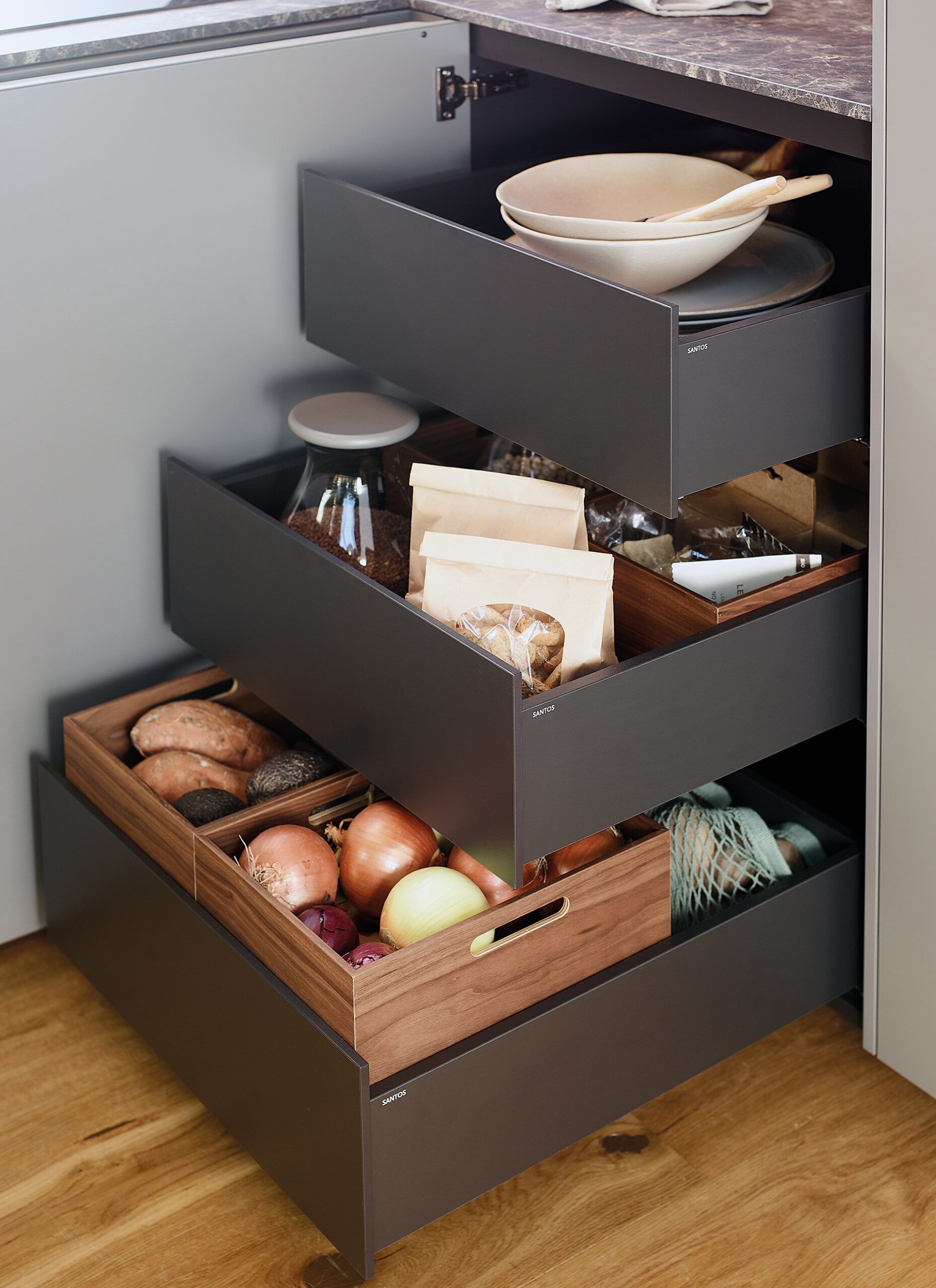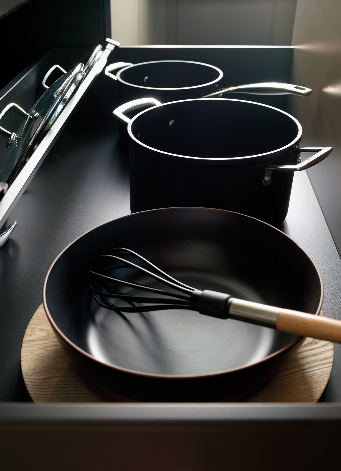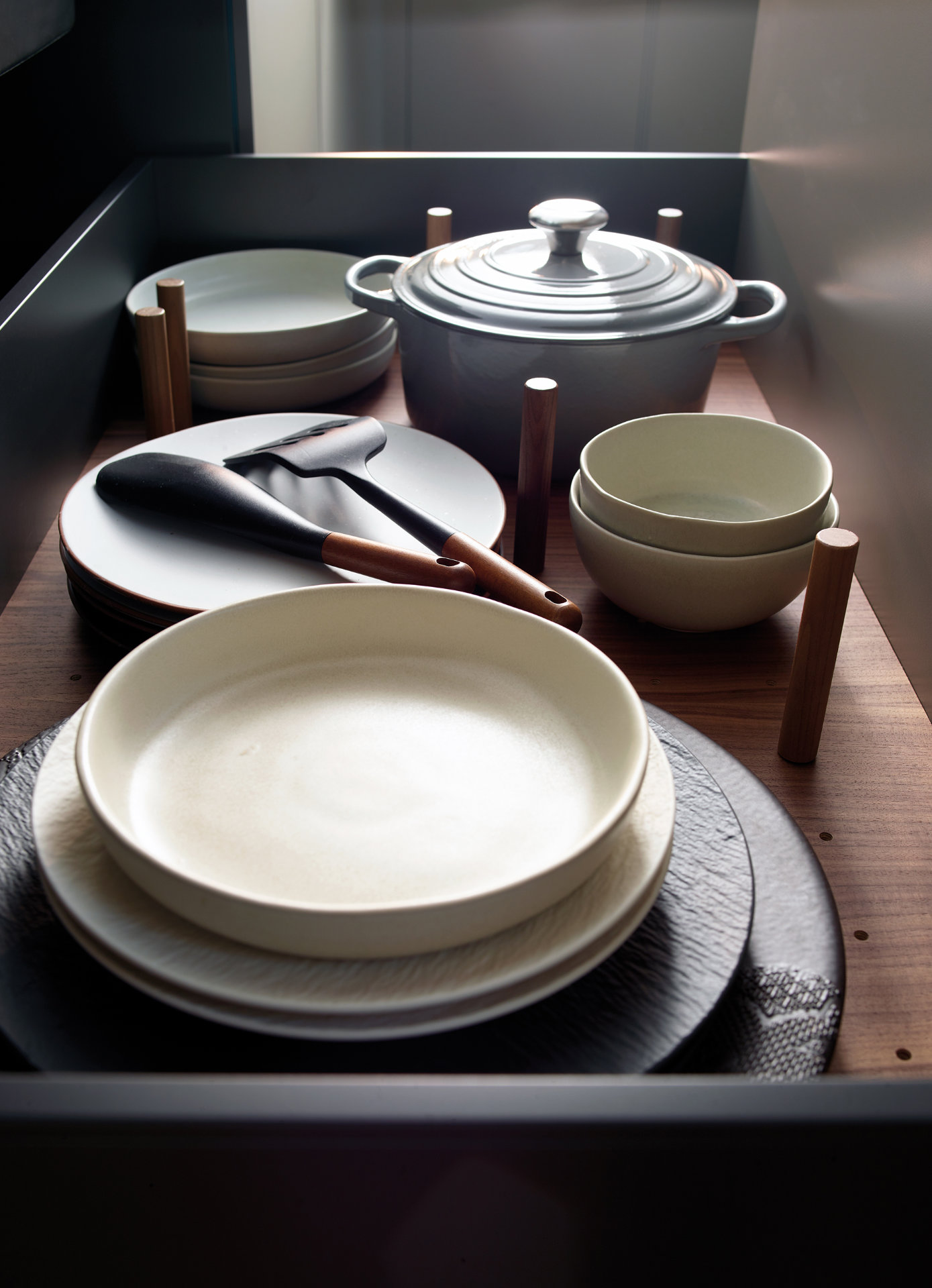 The double drawers are complemented by accessories that help to organise their interiors. At the top, the plate rack with its adjustable wooden pegs keeps tableware secure and tidy. At the bottom, the partitions help to classify pots, pans and large utensils.