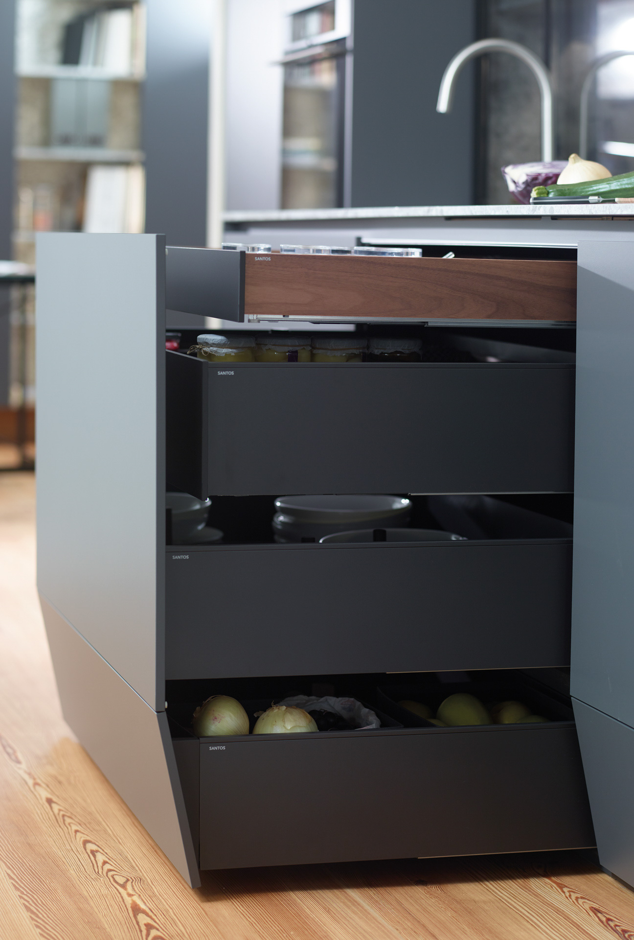 The base units in this in-line kitchen include three plinth drawers that expand their capacity down to the floor, for maximum organisation across four tiers of storage. The fronts of these drawers tilt inwards to prevent tripping when working near the work surface. On the other hand, the interior of the tall units gains more usable space thanks to the low-height plinths.