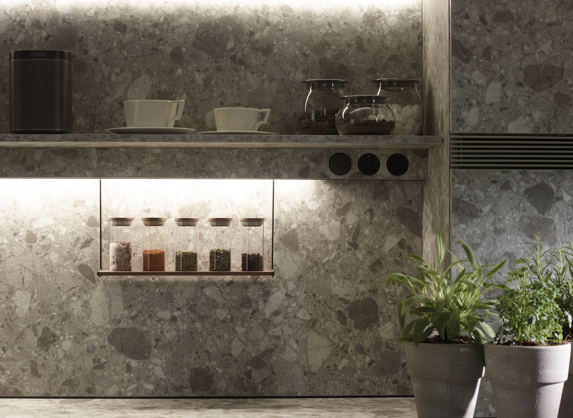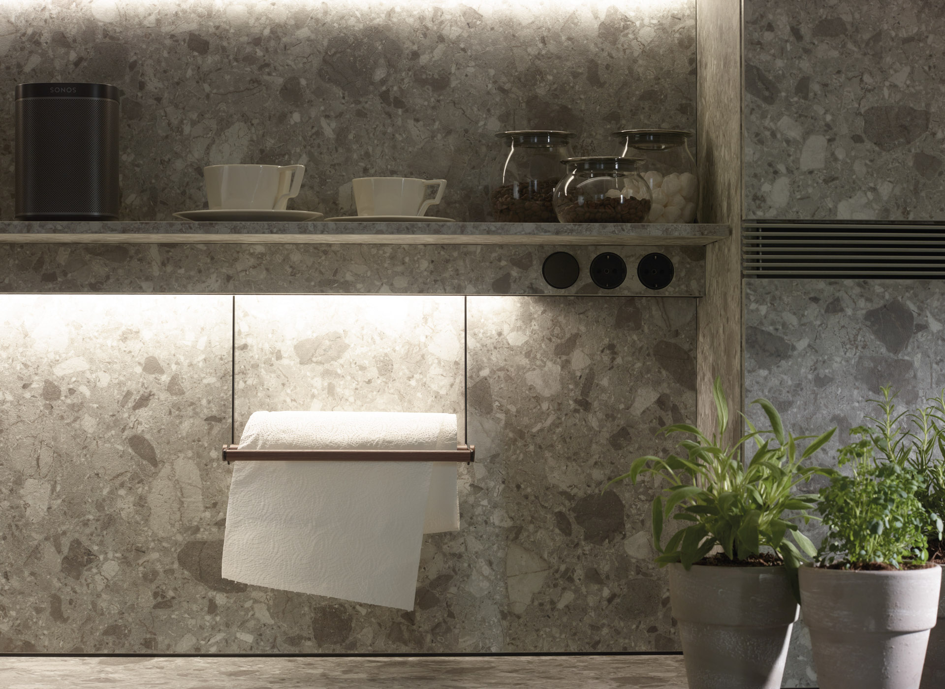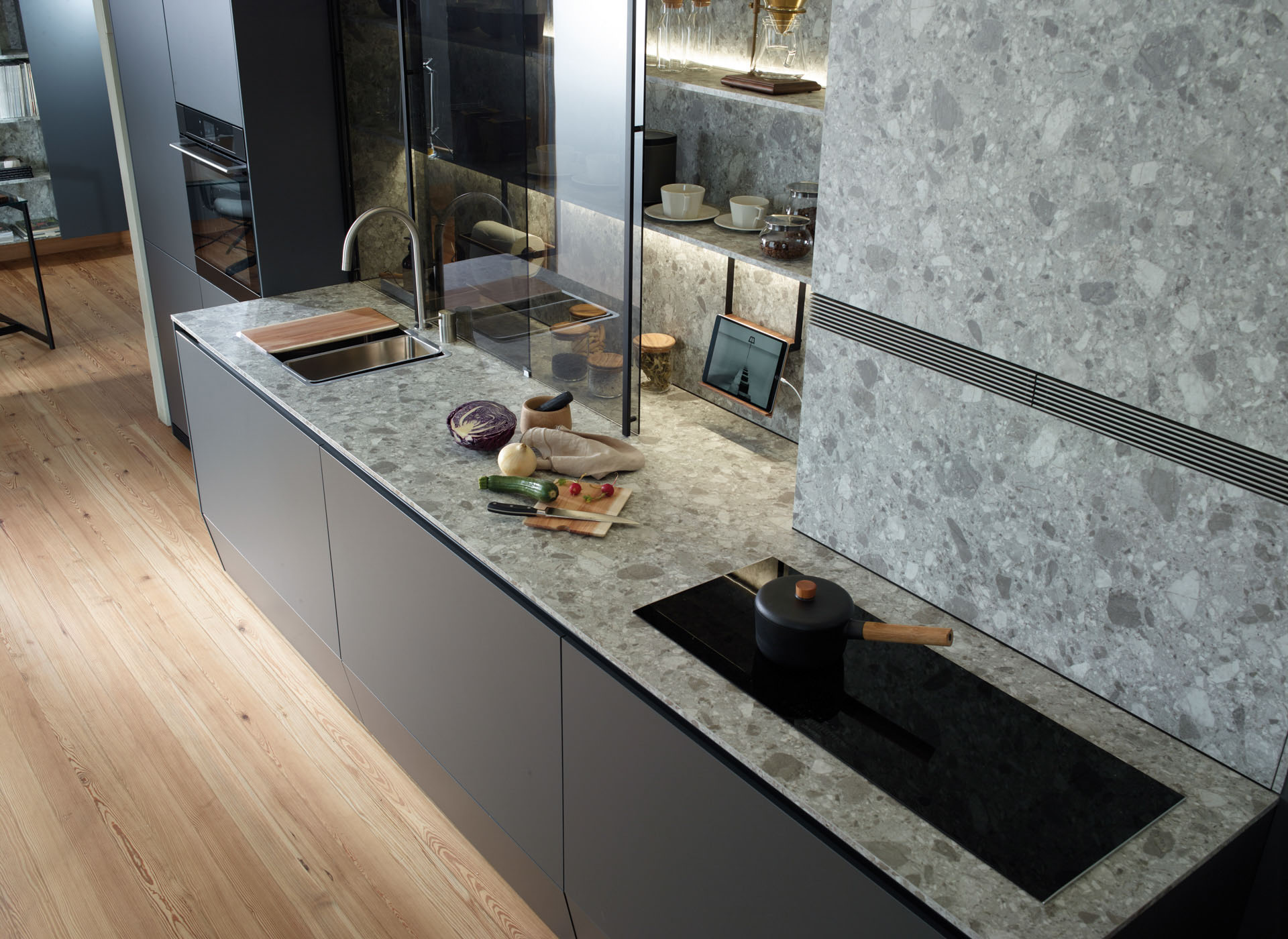The entire wall behind the glass door unit is segmented up to the ceiling by means of LED-based light sources. The lighting profile provides light for the work surface, comes with sockets and holds multiple accessories made of walnut wood: kitchen paper roll holder, multipurpose rack, spice rack, holder with porcelain container and tablet or book holder.