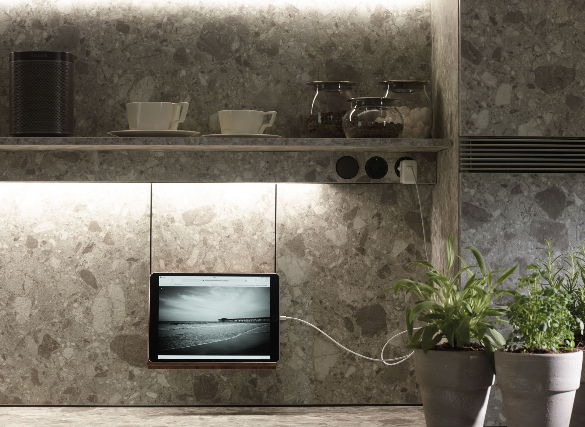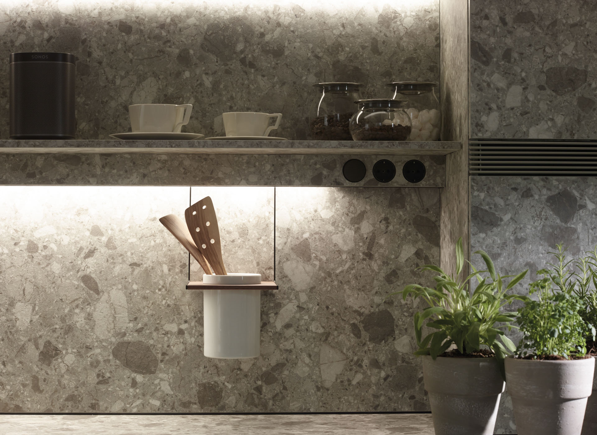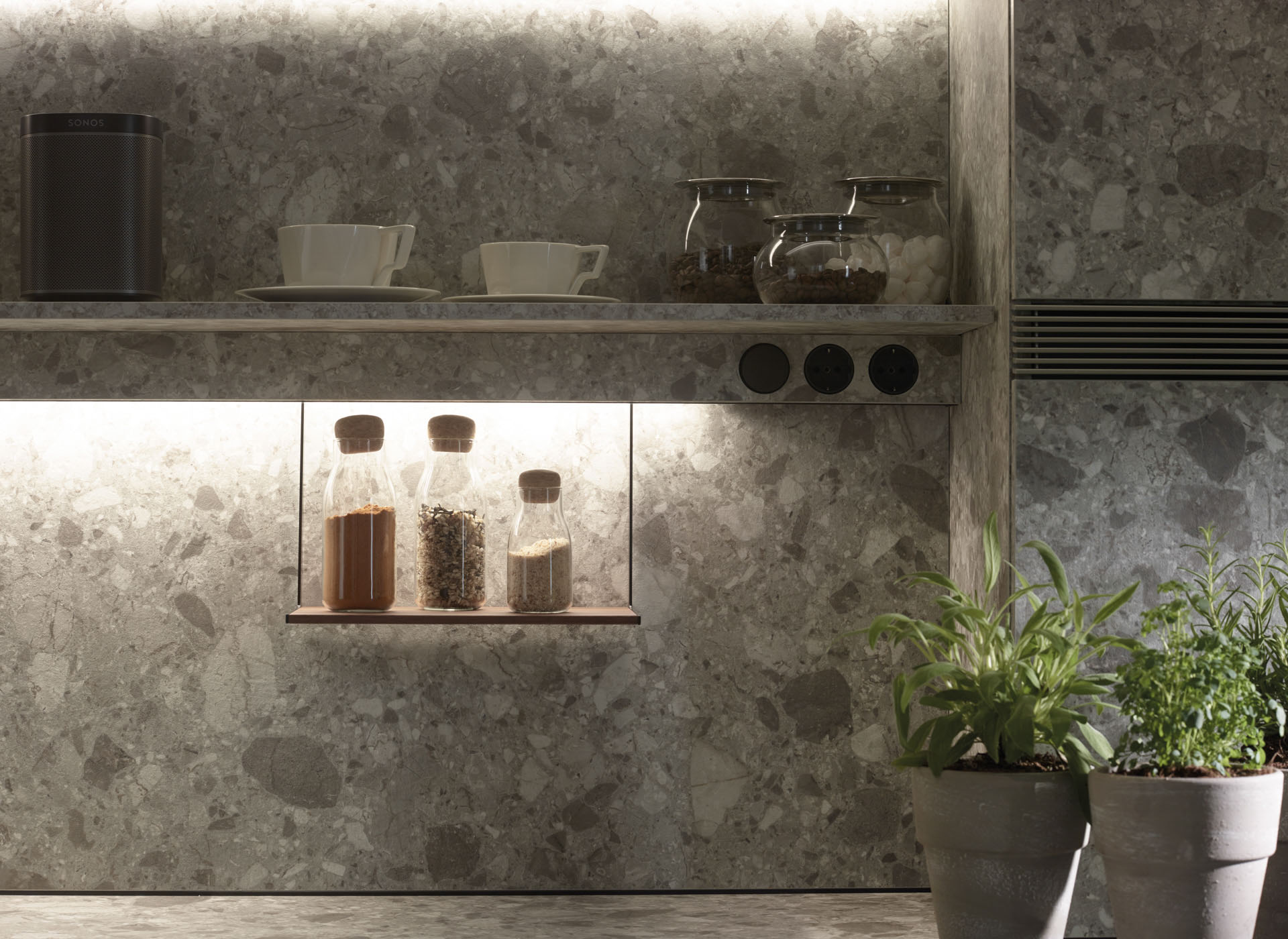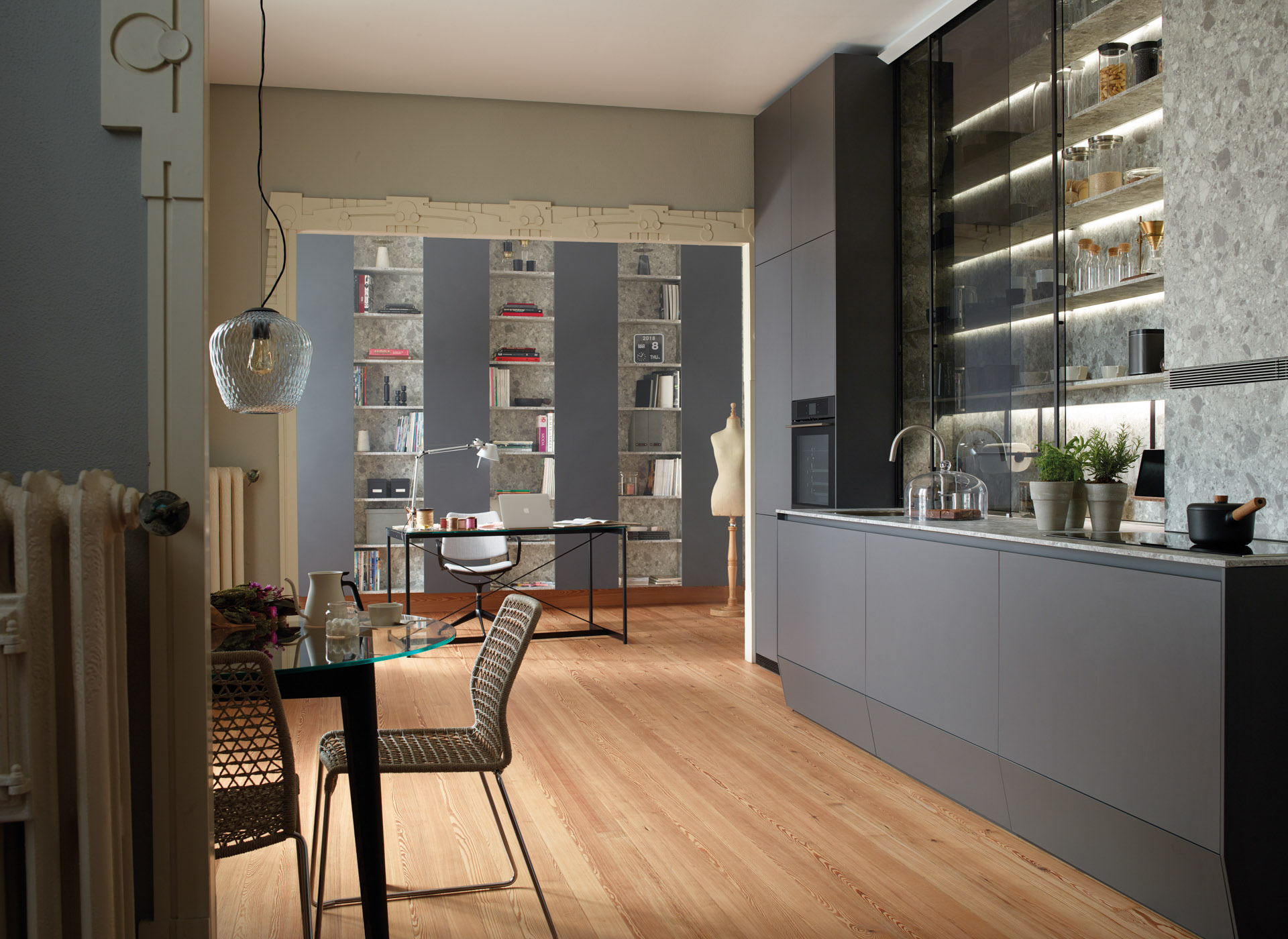 The entire wall behind the glass door unit is segmented up to the ceiling by means of LED-based light sources. The lighting profile provides light for the work surface, comes with sockets and holds multiple accessories made of walnut wood: kitchen paper roll holder, multipurpose rack, spice rack, holder with porcelain container and tablet or book holder.