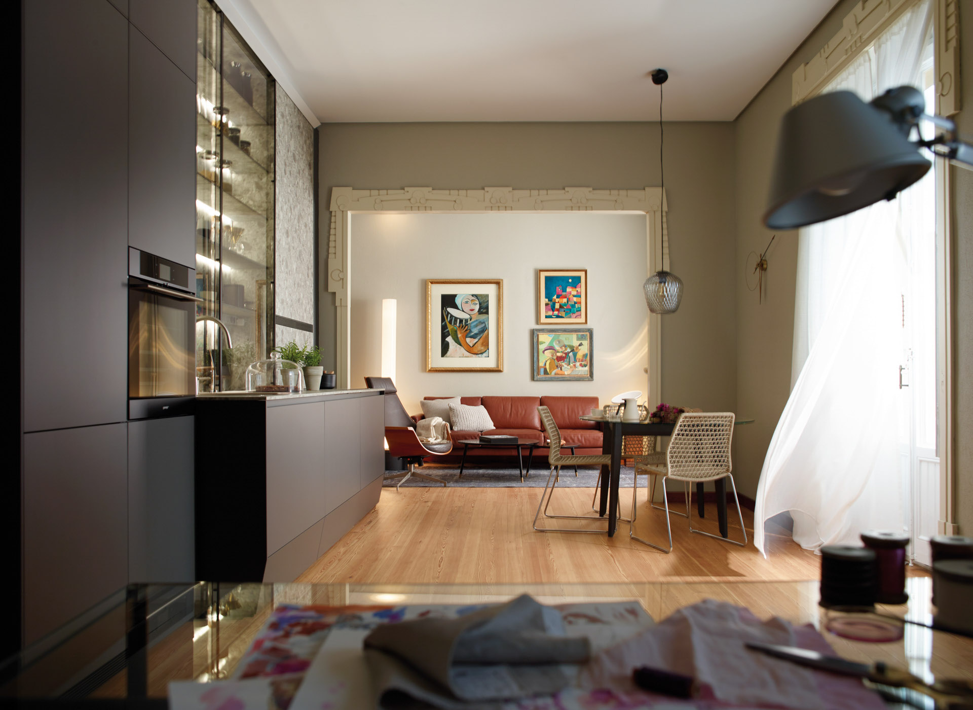 This modernist home has kept its most characteristic details intact, such as the mouldings, the wooden floor, the windows or the cast-iron radiators. Space limitations in terms of fit-out and storage were overcome by designing an in-line kitchen brimming with solutions that make the most of the full height of a partition from floor to ceiling. The lighting systems, finishes and sleek lines of the cabinets designed by Santos make it possible for them to seamlessly blend into the design without overwhelming it.