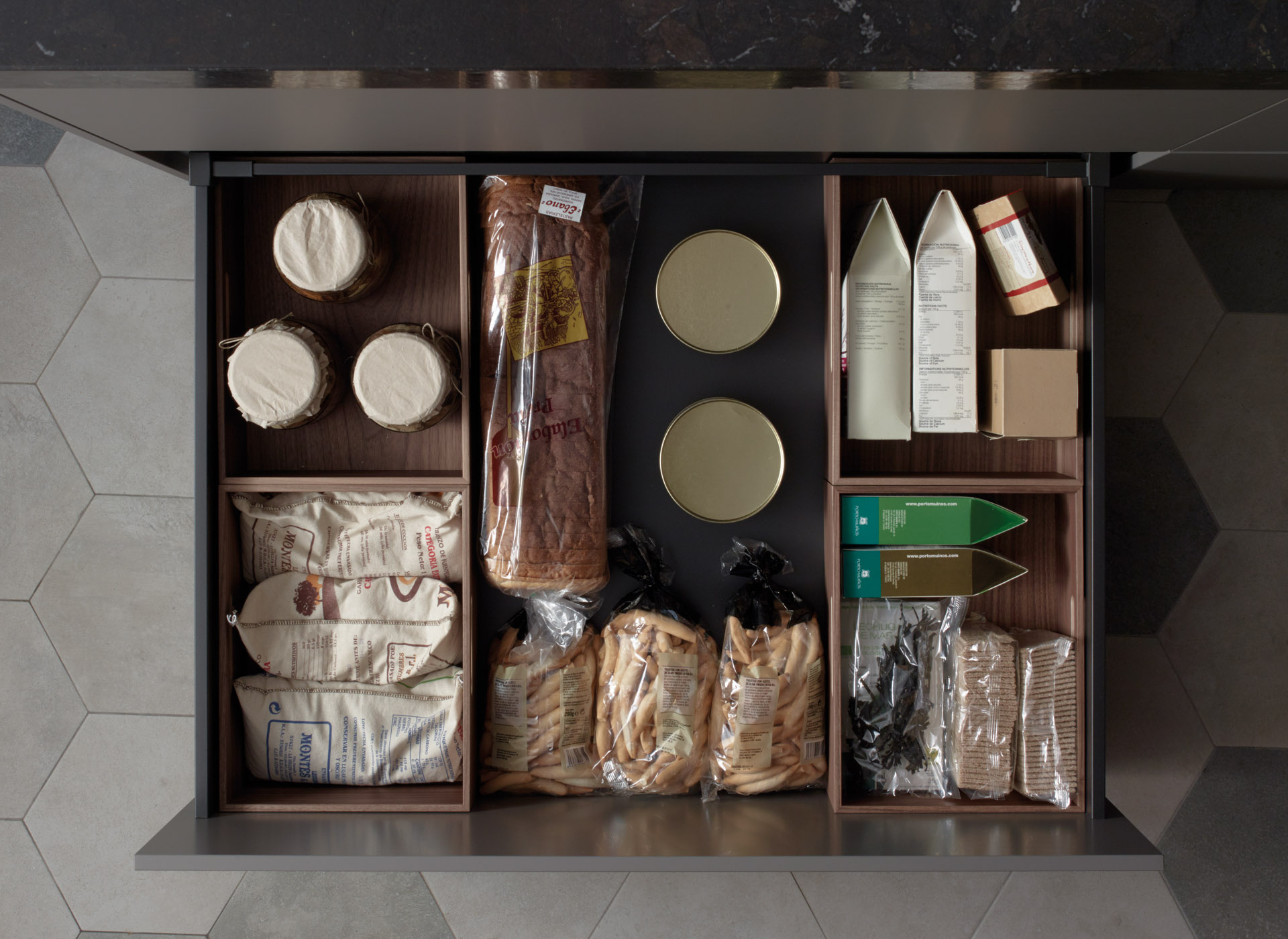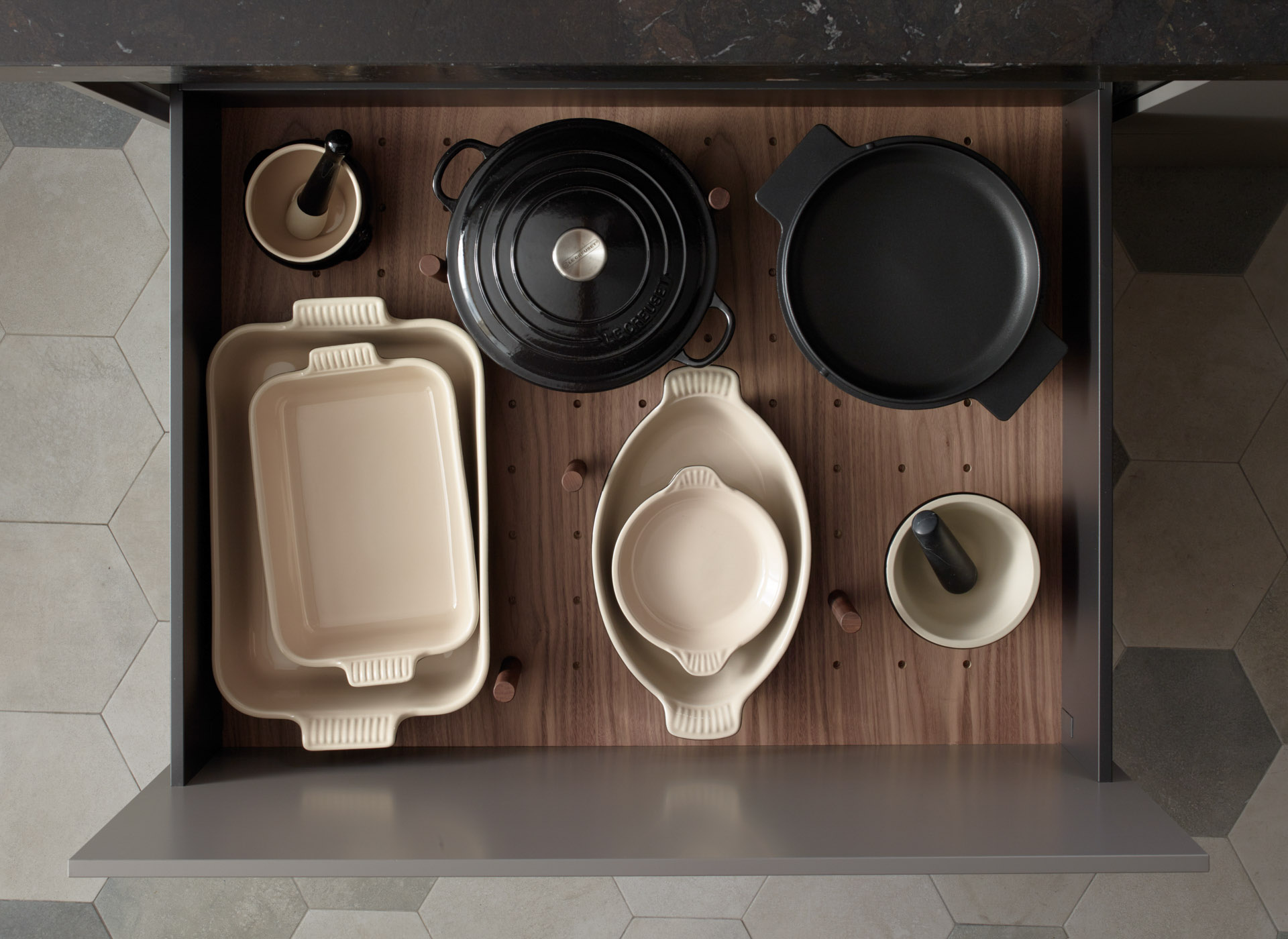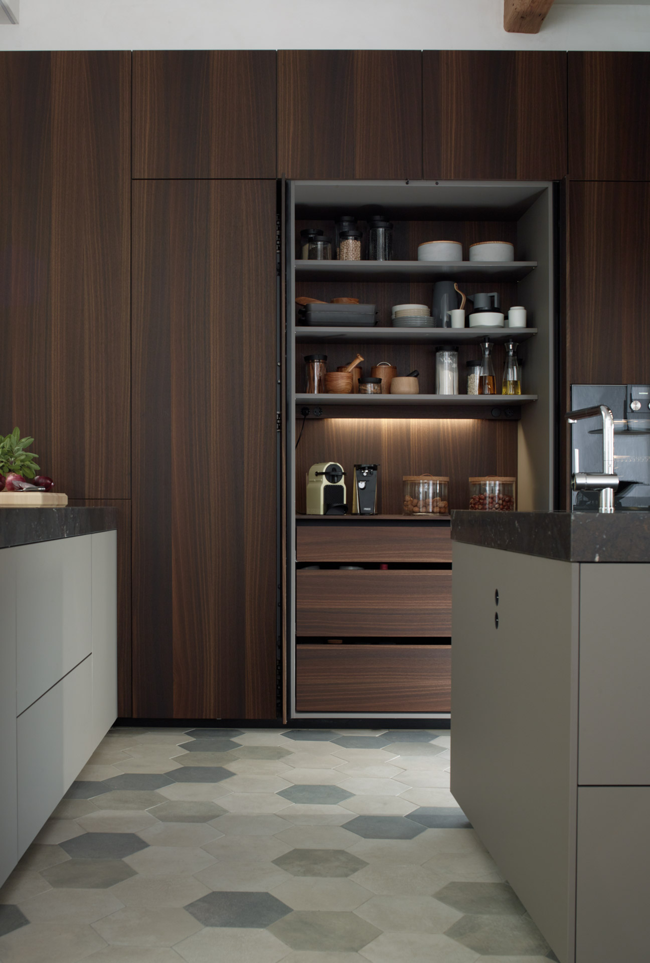 The tall unit with retractable doors provides great capacity for the storage of tableware and food. Its fronts can be hidden away along the sides of the cabinet, which includes a work area with lighting and sockets which come in very handy for small appliances. It’s the perfect place to prepare breakfast, coffee at any time of day, shakes, etc. At the bottom of the tall units, the interior drawers make it a snap to organise and access their contents. The grain remains continuous throughout the entire front of the tall units, creating a natural, harmonious appearance.