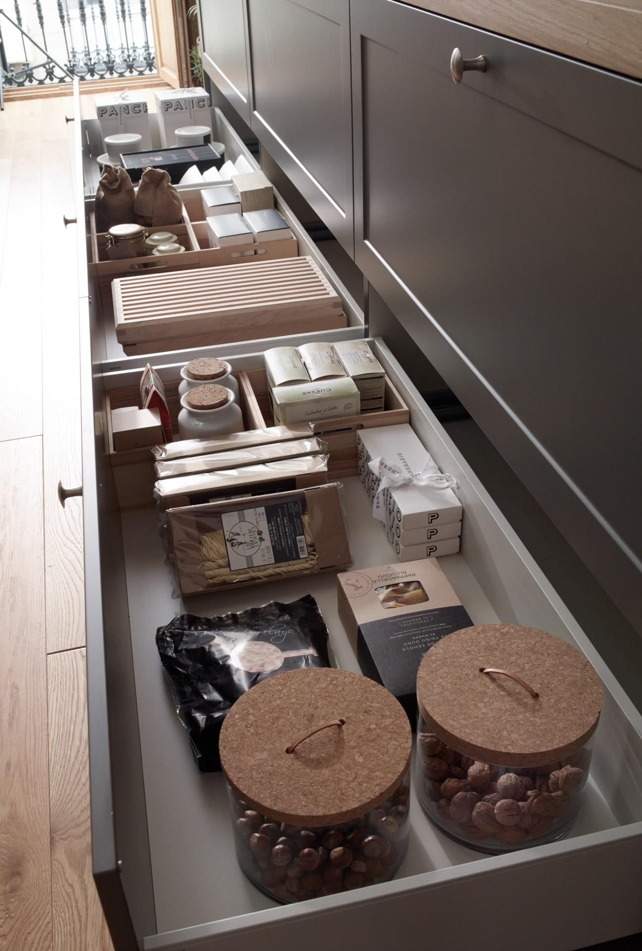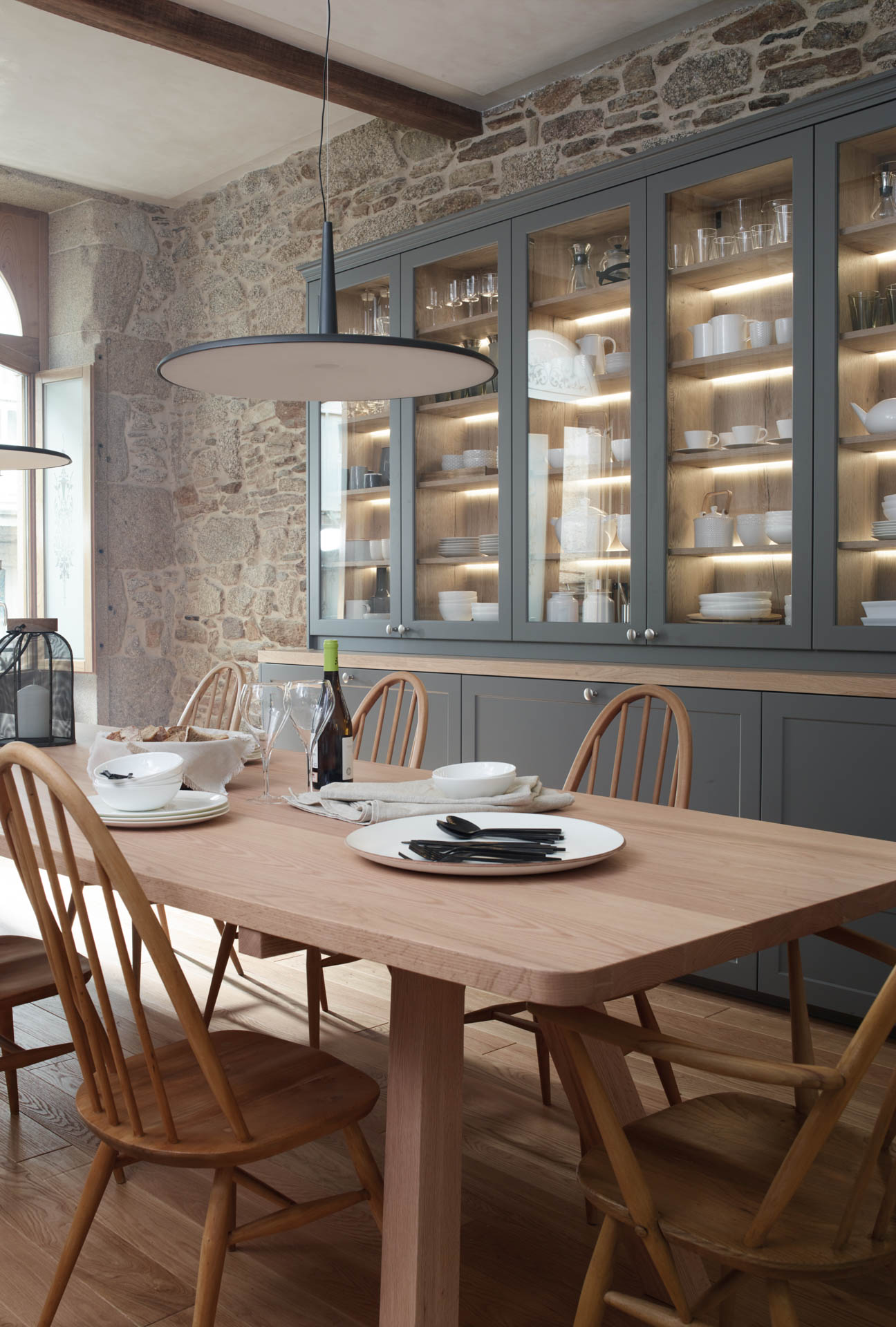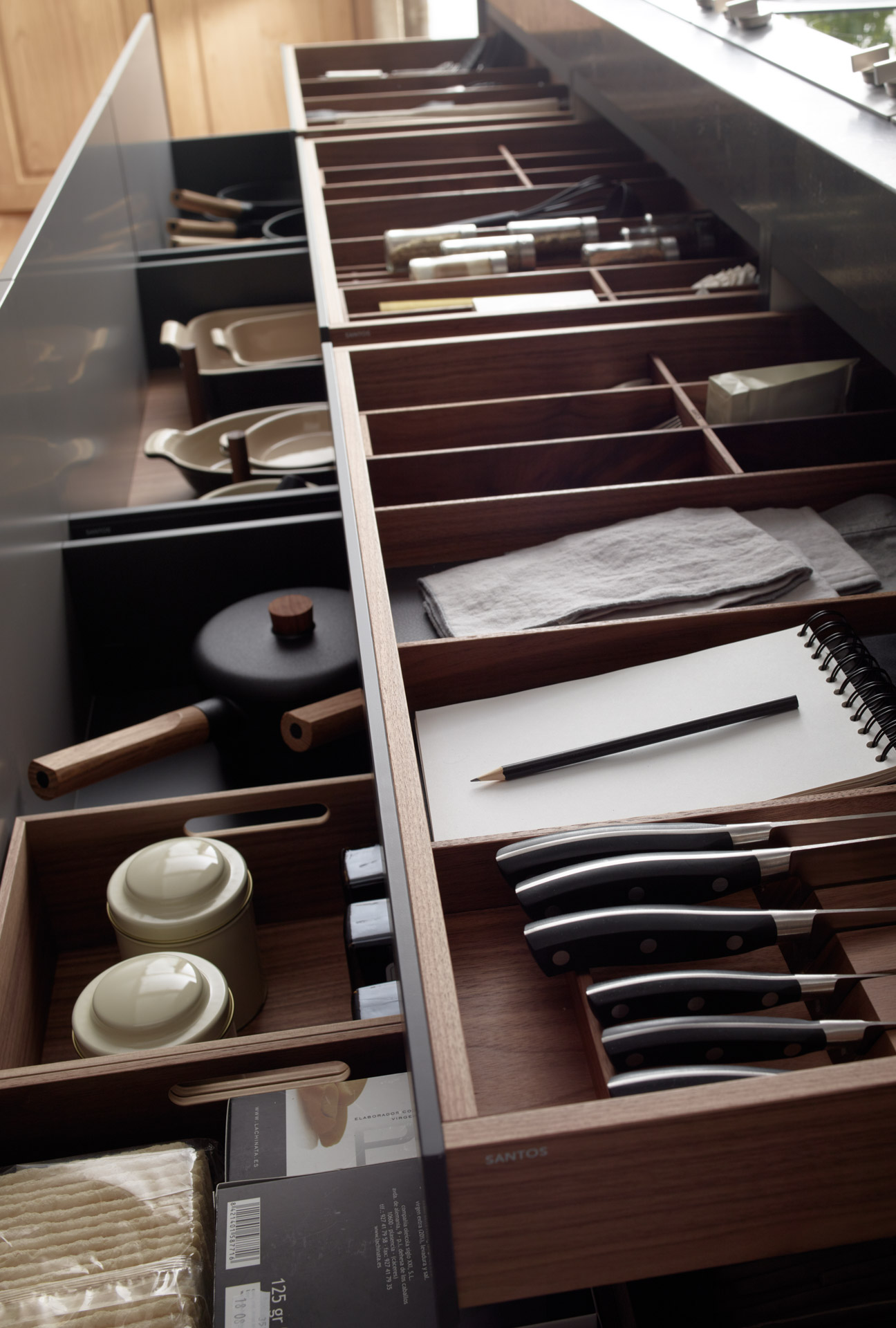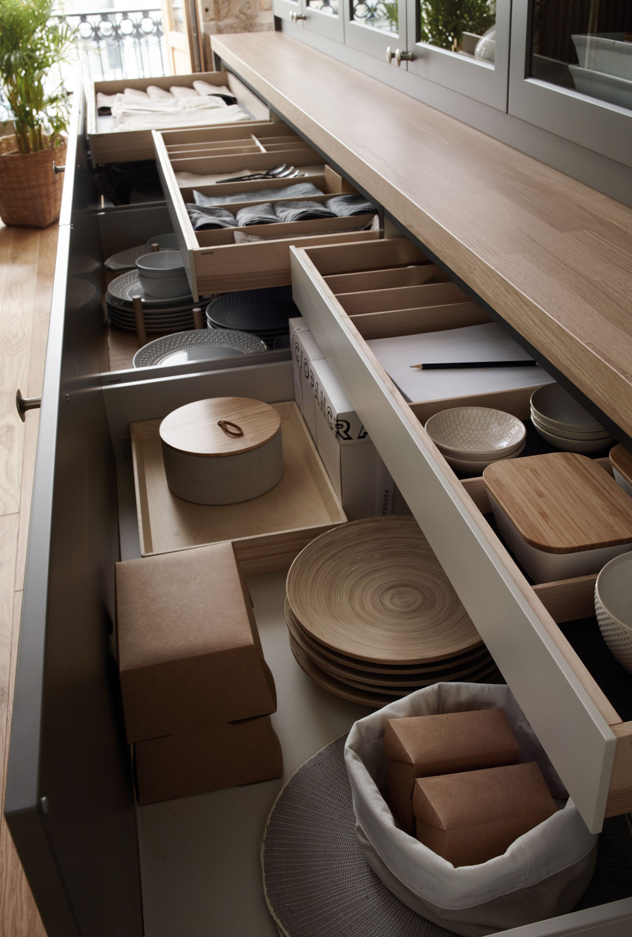 The tall unit with retractable doors provides great capacity for the storage of tableware and food. Its fronts can be hidden away along the sides of the cabinet, which includes a work area with lighting and sockets which come in very handy for small appliances. It’s the perfect place to prepare breakfast, coffee at any time of day, shakes, etc. At the bottom of the tall units, the interior drawers make it a snap to organise and access their contents. The grain remains continuous throughout the entire front of the tall units, creating a natural, harmonious appearance.