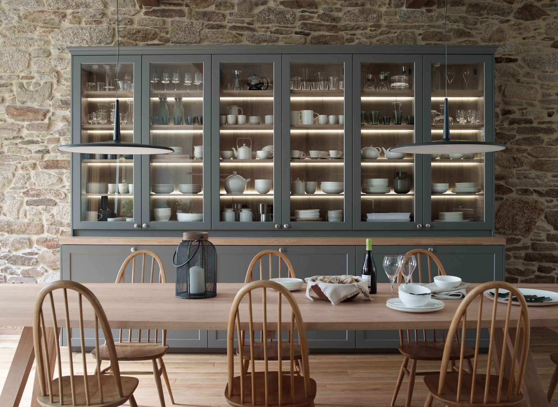 The dining area has a large sideboard with glass door units at the top, and an interior lighting system for shelves, which turns it into a source of indirect ambient light. Its base units come with three drawers, fitted to hold implements common to the dining area: cutlery dividers, a place for serving trays, tablecloths and napkins, etc.