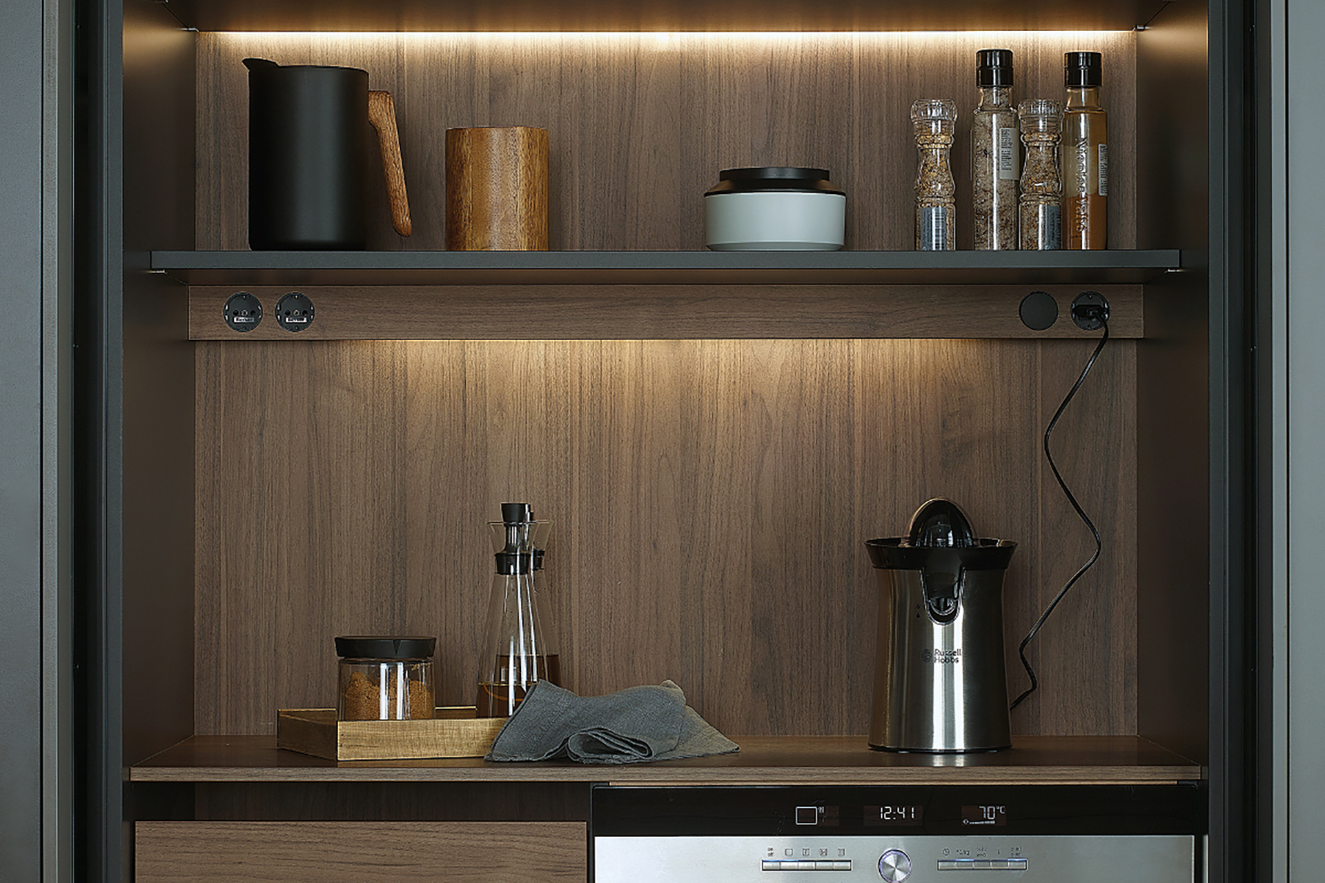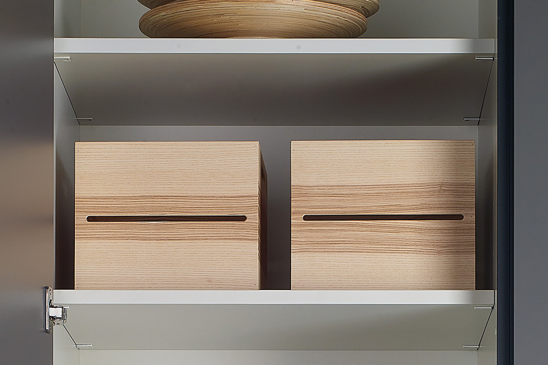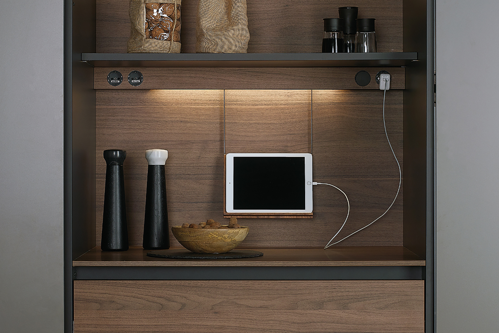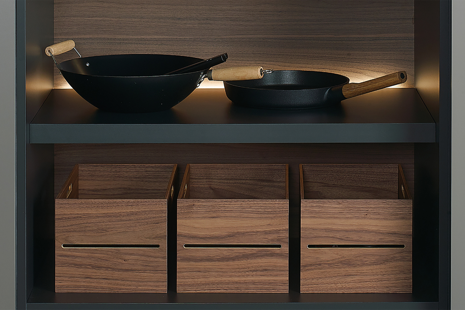 The wooden containers in walnut wood or olive ash wood provide the perfect solution for the storage of fruits and vegetables in both the tall units and glass door units.