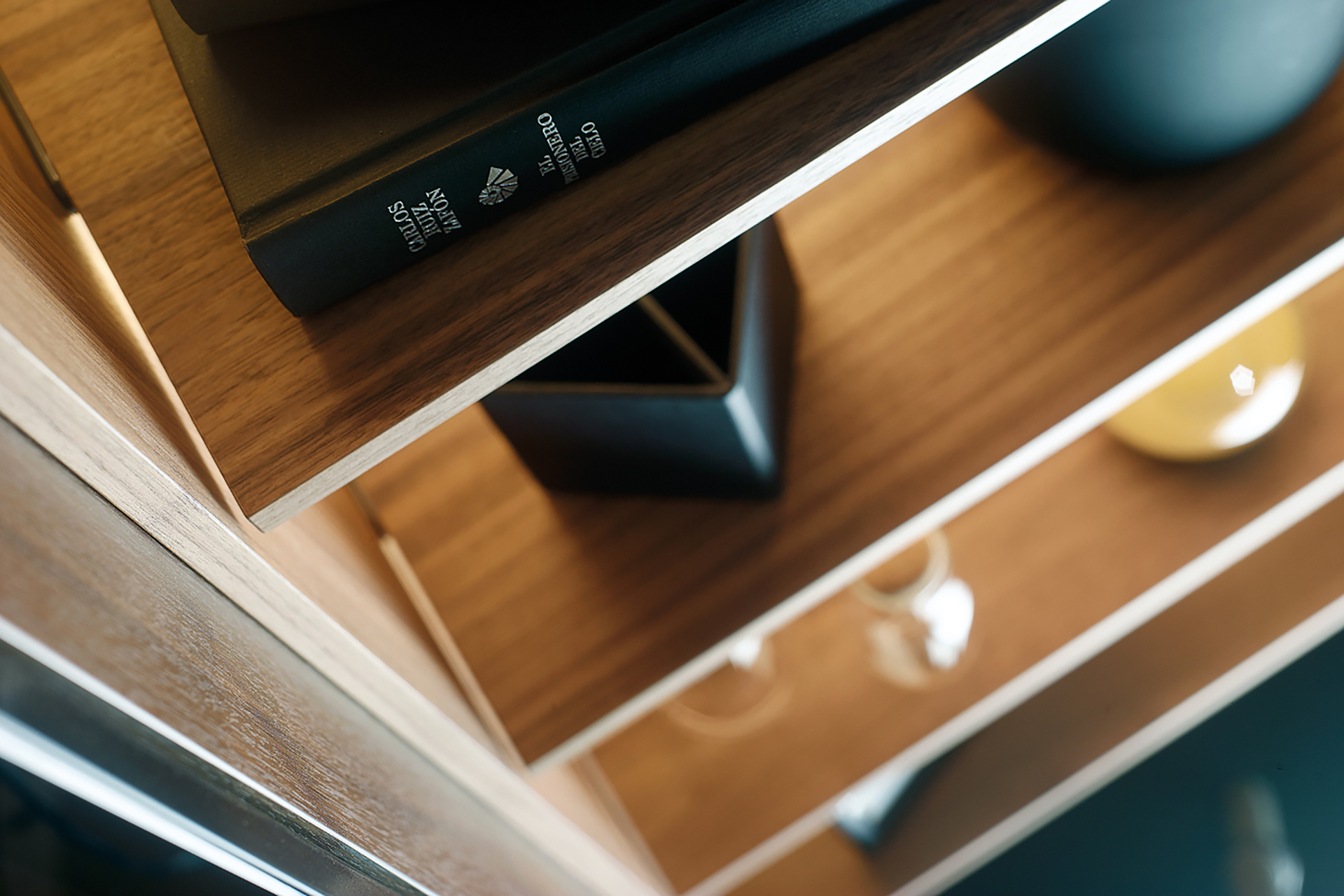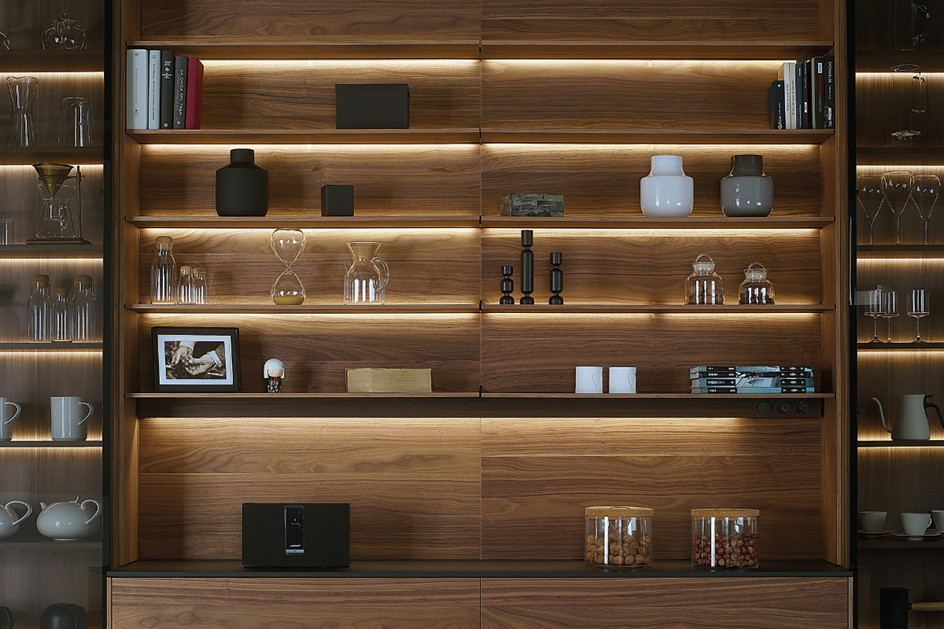 The glass doors and interiors of tall units take centre stage with the interior lighting system for shelves, which turns the cabinets into a source of indirect ambient lighting.