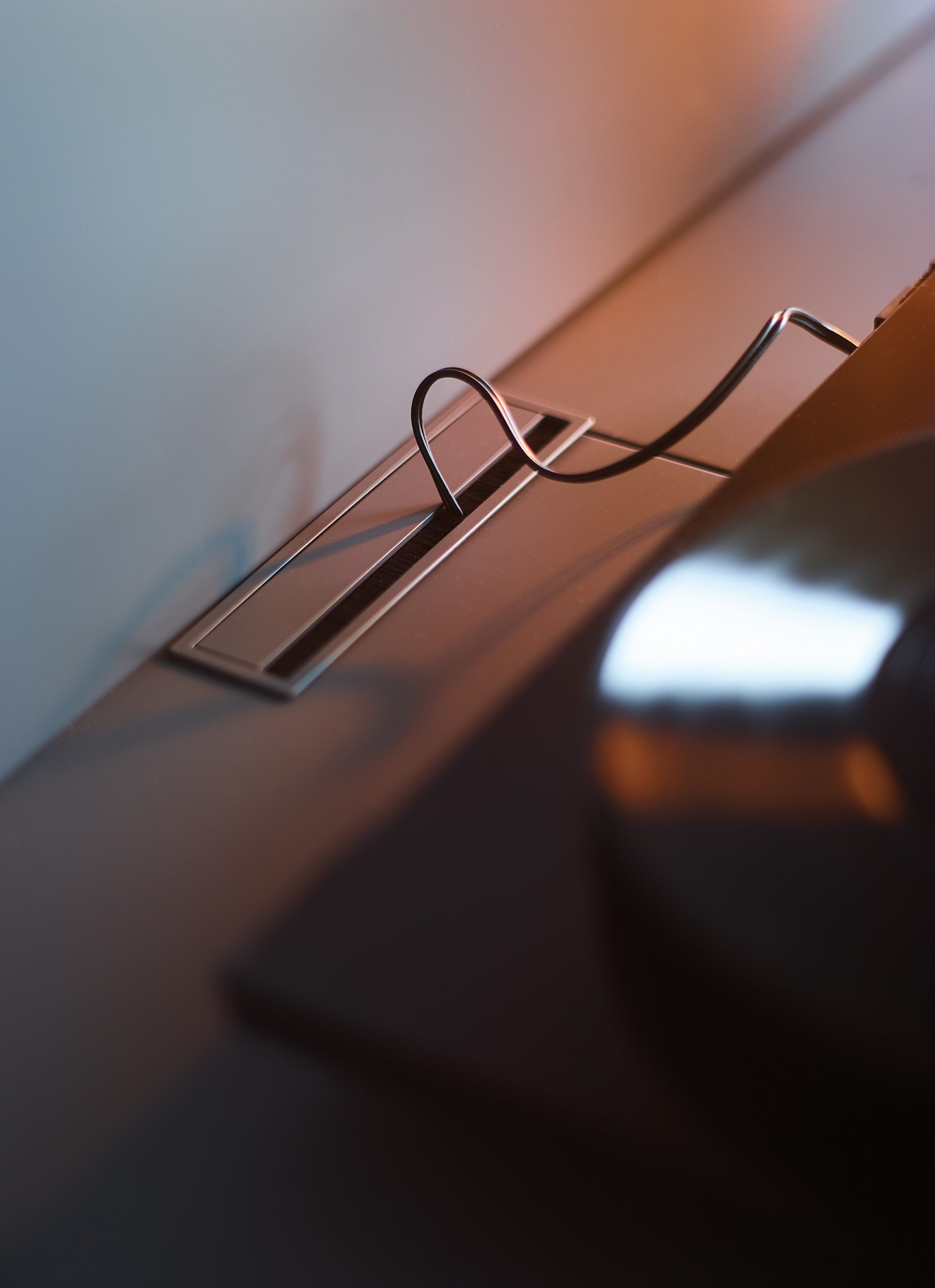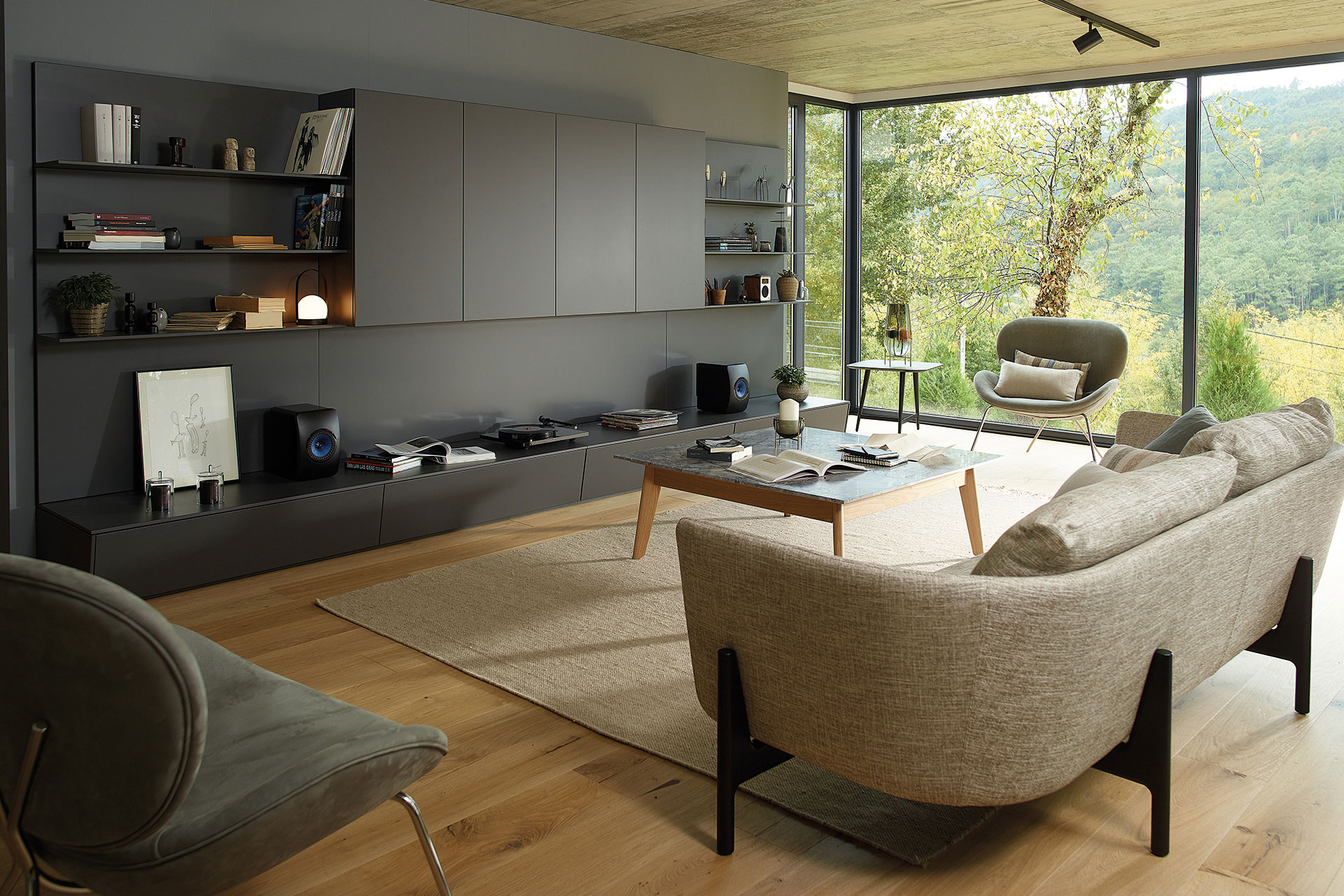The plinth drawers integrated into the bottom of the living room furniture offer a large storage space. Their fronts, tilted inwards, keep users from tripping when moving near the piece of furniture. The top cover panel, located above them, serves as a suitable surface for audiovisual systems. It can be rounded off with a discreet cable grommet accessory, which keeps the different connectors organised.