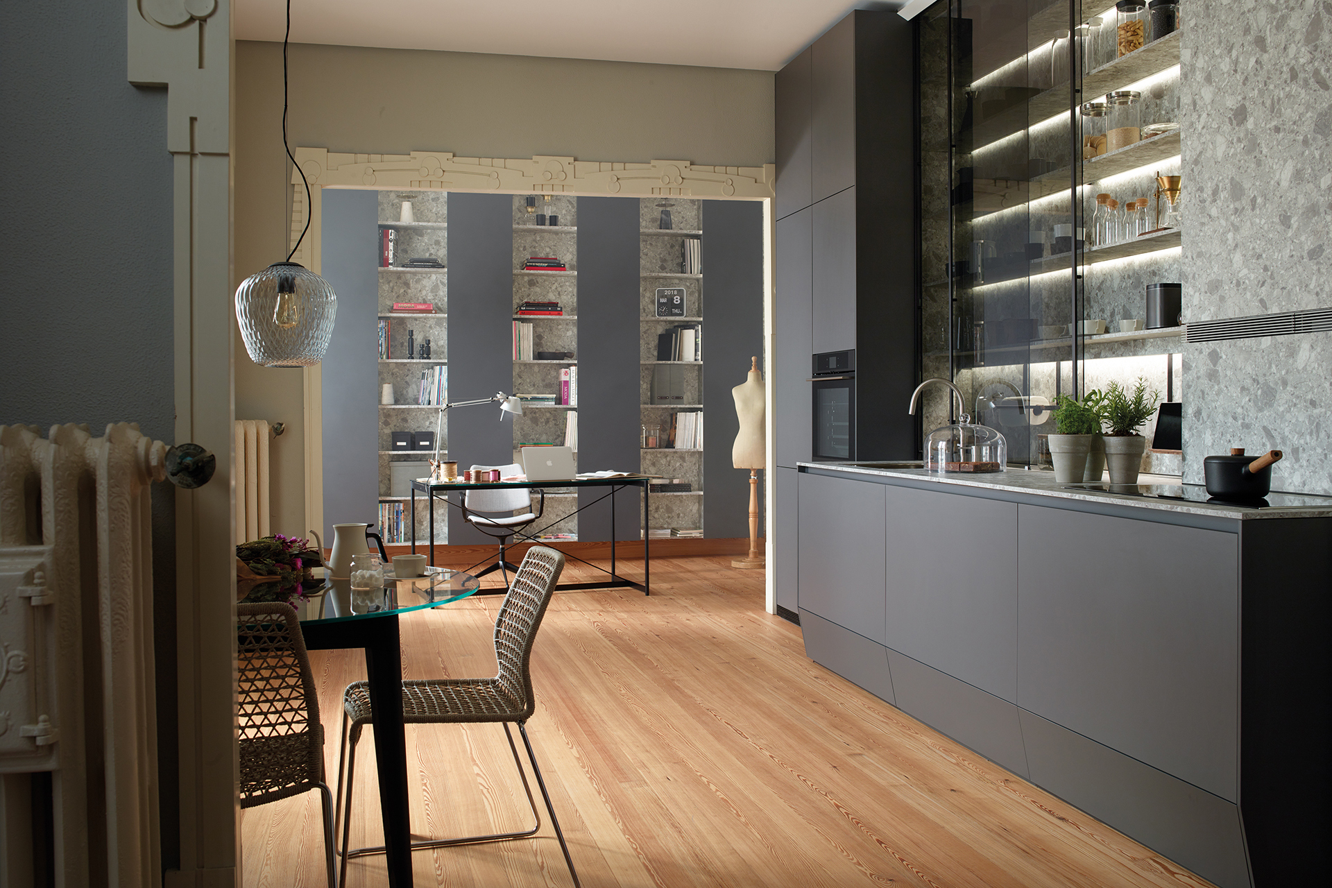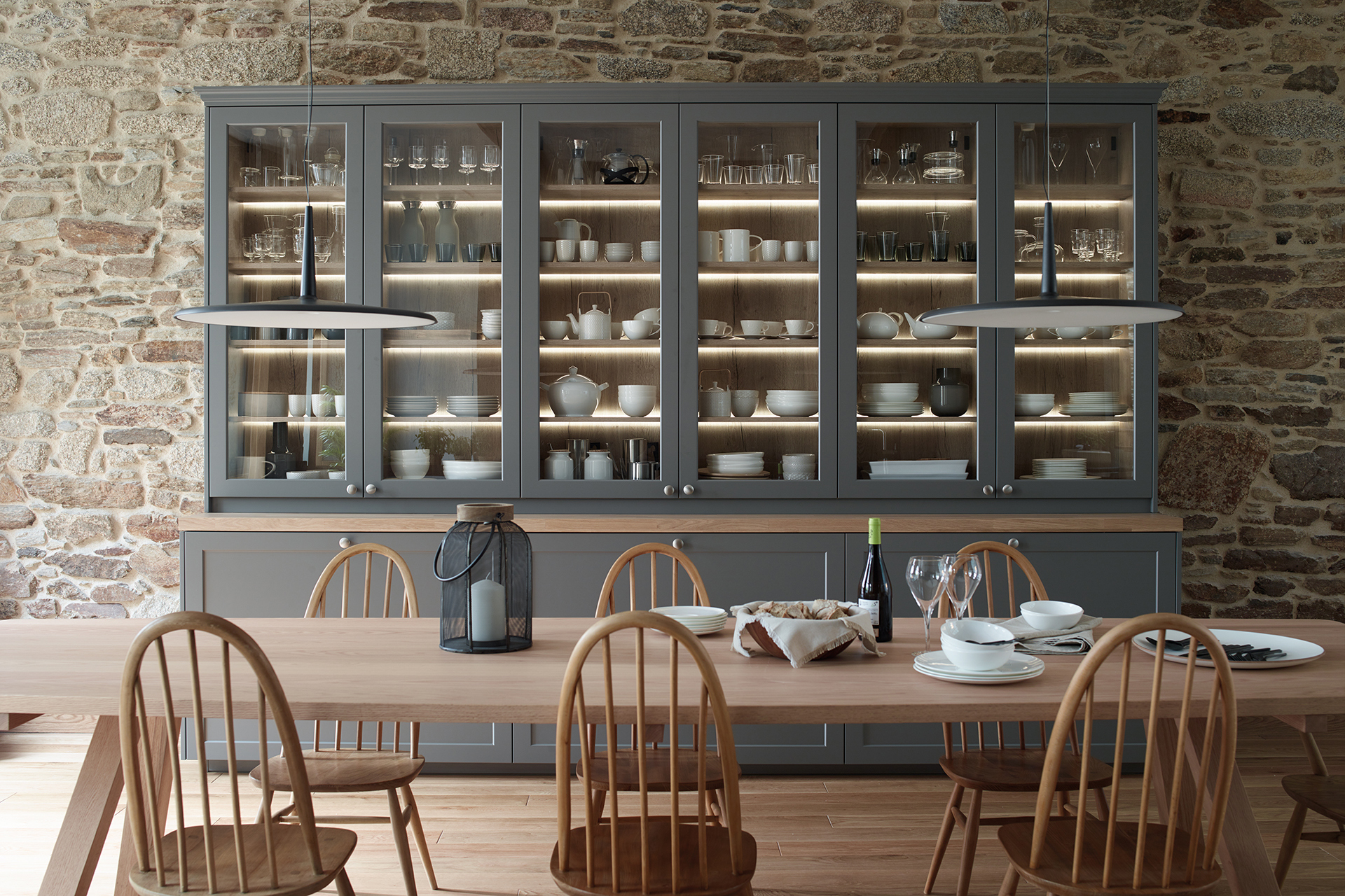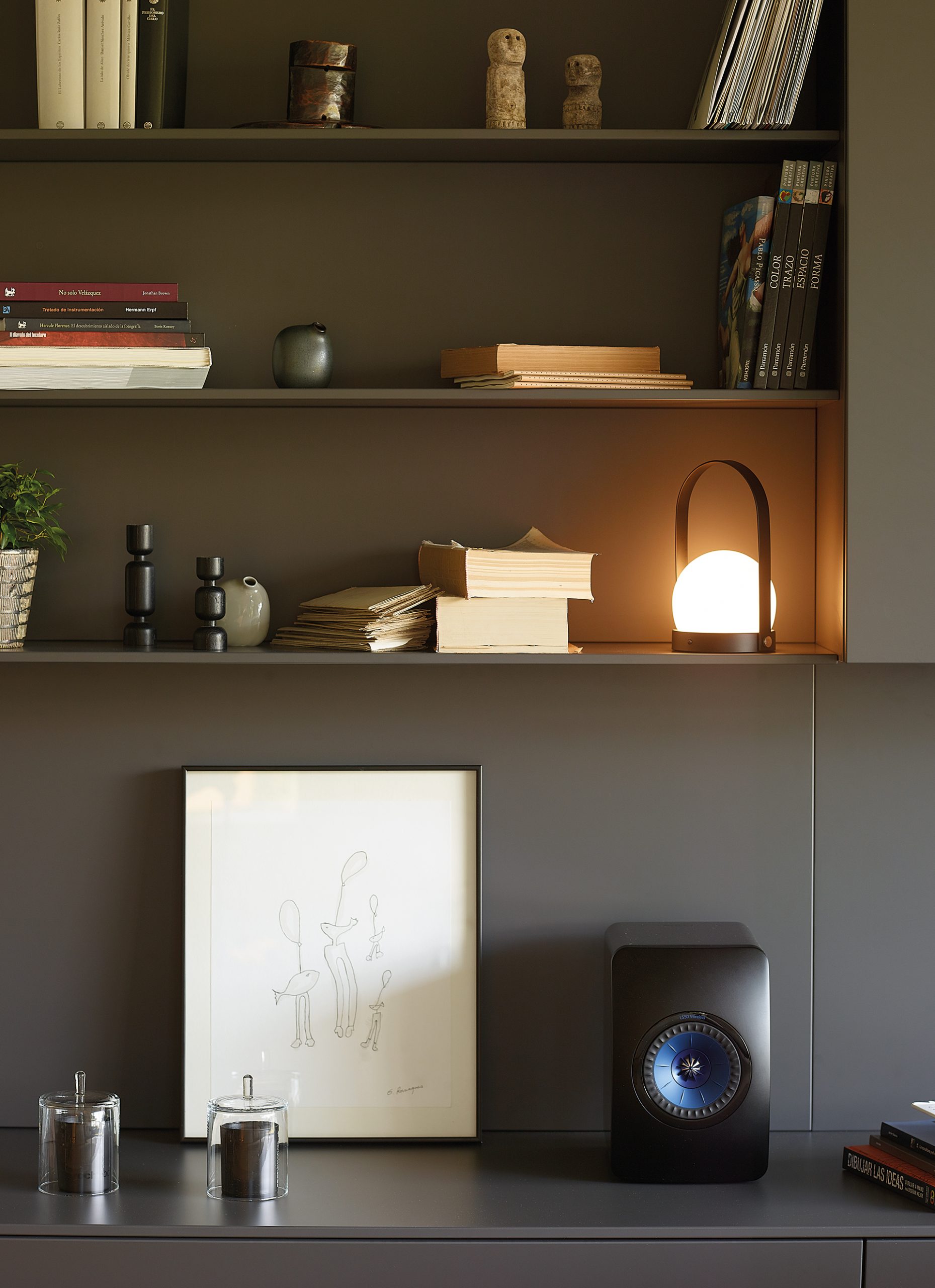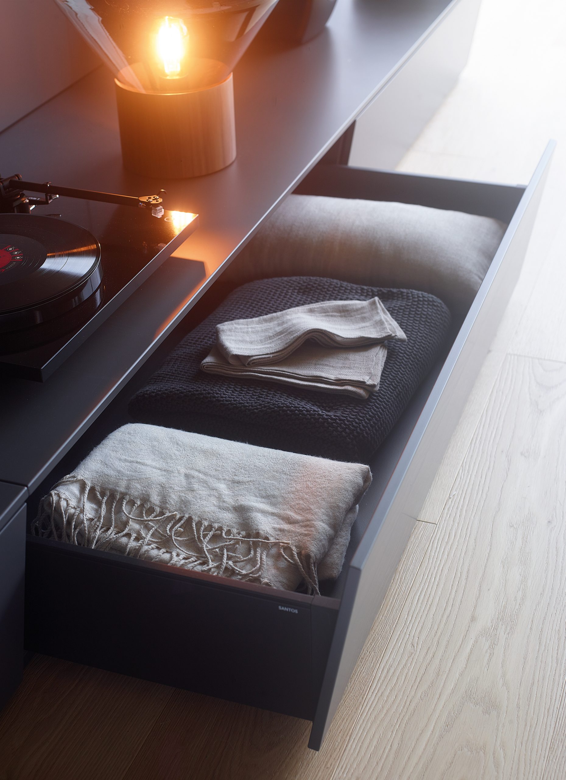 The Living line by Santos includes modules that can be mixed and matched to create living room furniture, glass door units, sideboards, shelves and panels with shelves. Thanks to its modular design, this furniture system adapts to any space, taste or need. All the units can share the same finishes, contributing towards reinforcing continuity between the kitchen and the rest of the rooms. Furthermore, they can be suspended to reduce their visual weight or complemented with indirect lighting systems, which help to create warm and cosy atmospheres.