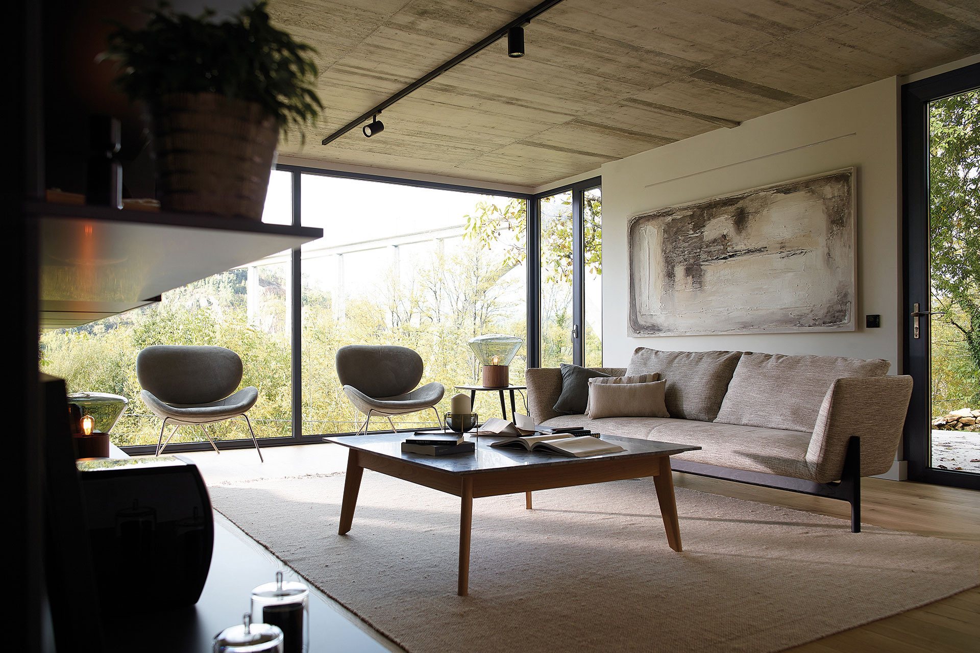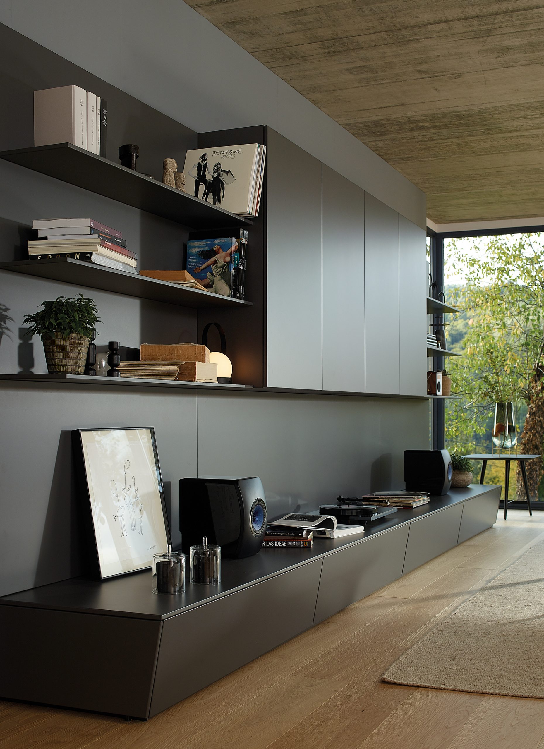 The living room furniture combines beauty, functionality and versatility. Its clean lines and reduced-thickness materials minimise the impact of the whole and make it easy to integrate into the architecture. The modular system rationally segments and stratifies the entire space both vertically and horizontally, providing it with multiple storage, organisation and display options.